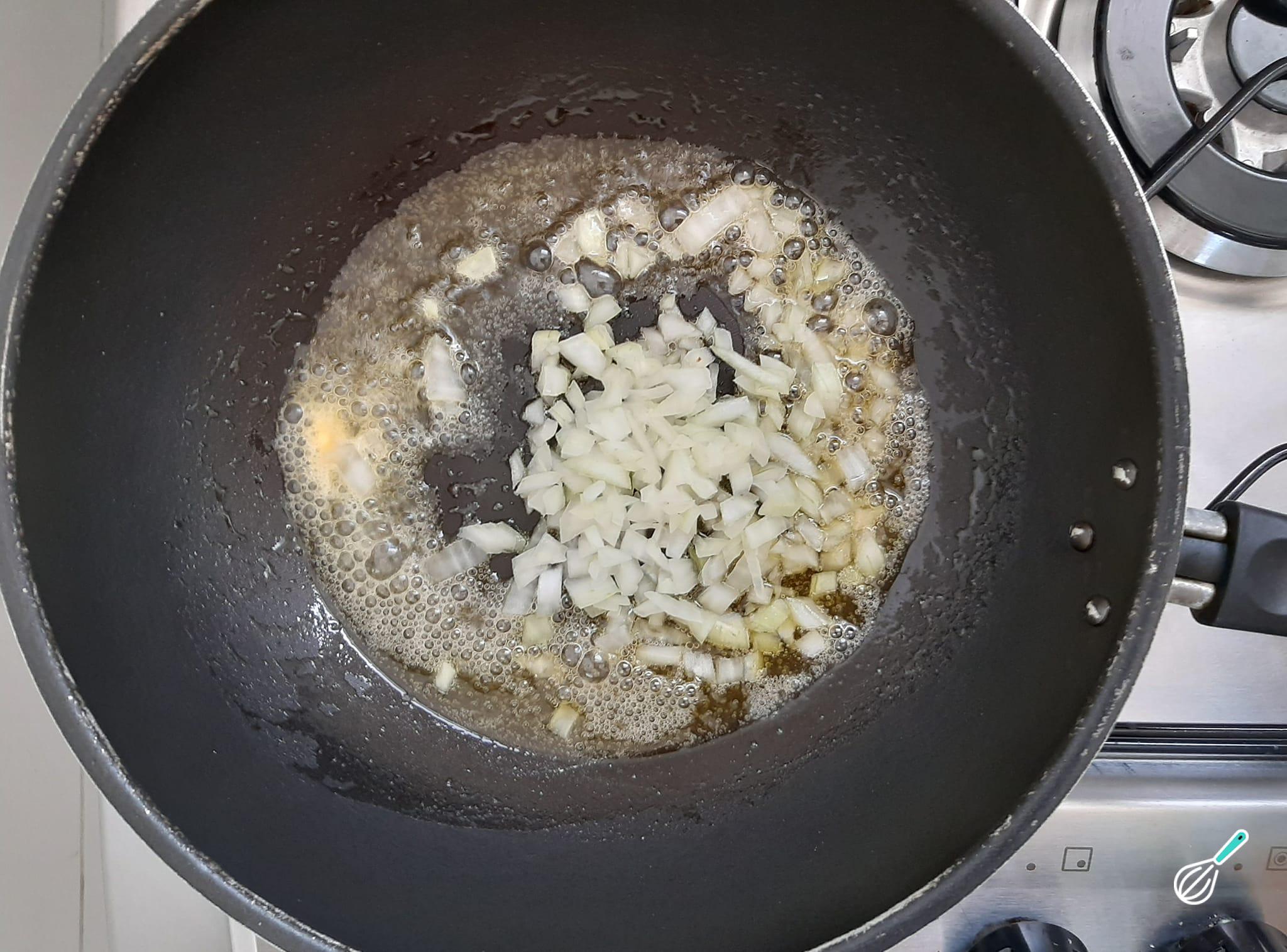 Numa frigideira média, aqueça a manteiga de garrafa e refogue a cebola em fogo baixo até ela murchar.