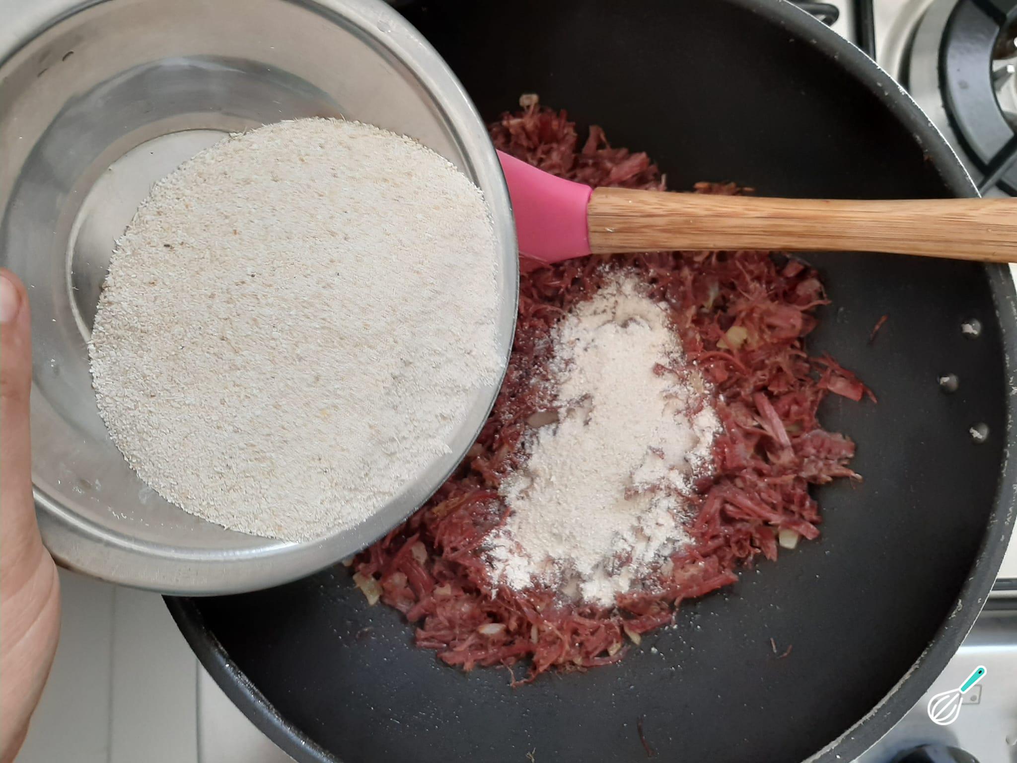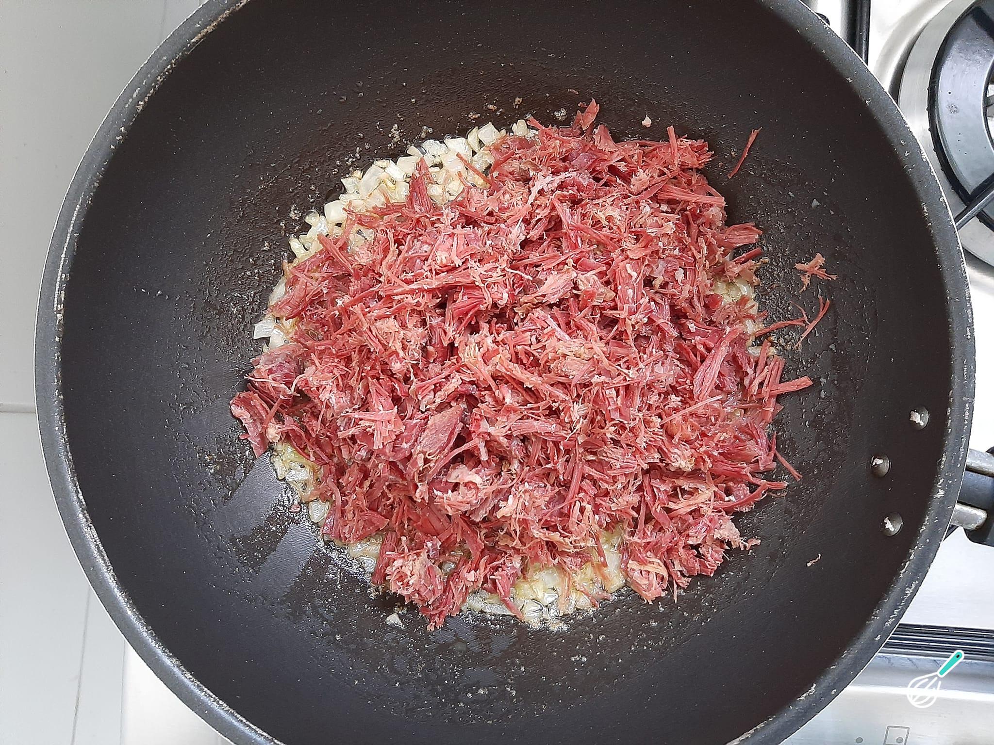 Acrescente a carne seca desfiada e deixe-a refogando por cerca de 8 minutos em fogo baixo, envolvendo todos os ingredientes.