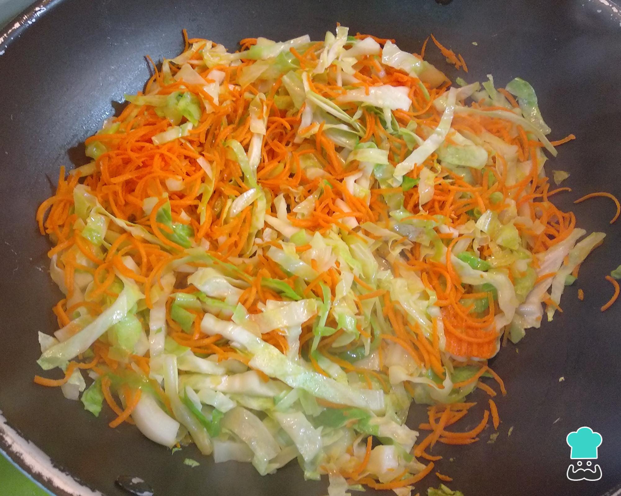 Depois junte o repolho fatiado, misture e deixe refogar por 2 minutos. Após, junte a cenoura ralada, misture tudo e deixe por mais 1 minuto no foto ou até estes legumes começarem a murchar. Tempere com sal e pimenta a gosto.