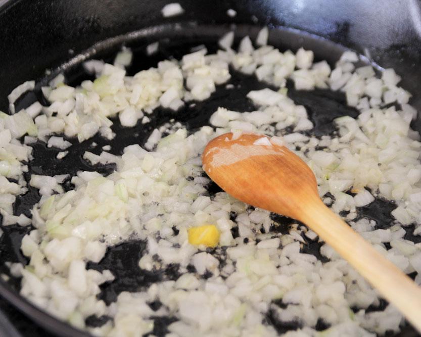 Leve ao fogo uma frigideira funda ou panela com a manteiga. Quando a manteiga derreter adicione a cebola picada e refogue até começar a dourar.