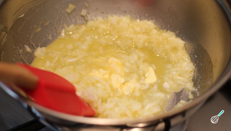 O primeiro passo no preparo da sua farofa é picar a cebola finamente e levá-la a refogar em fogo baixo com a manteiga.