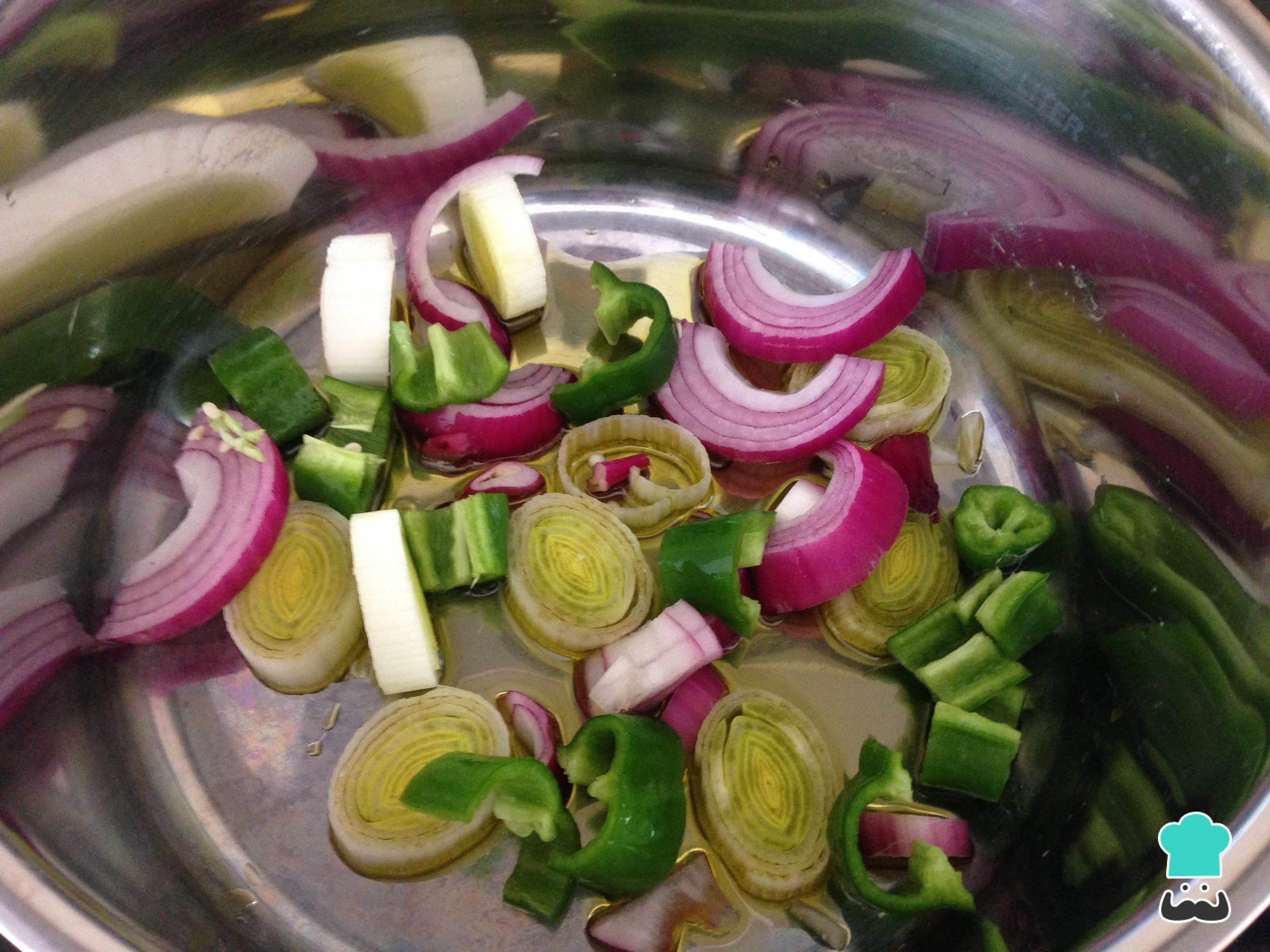 Prepare um refogado com cebola, alho-poró e pimentão. Adicione um pouco de sal e refogue por 3 minutos. Não importa o tamanho que corta os vegetais.