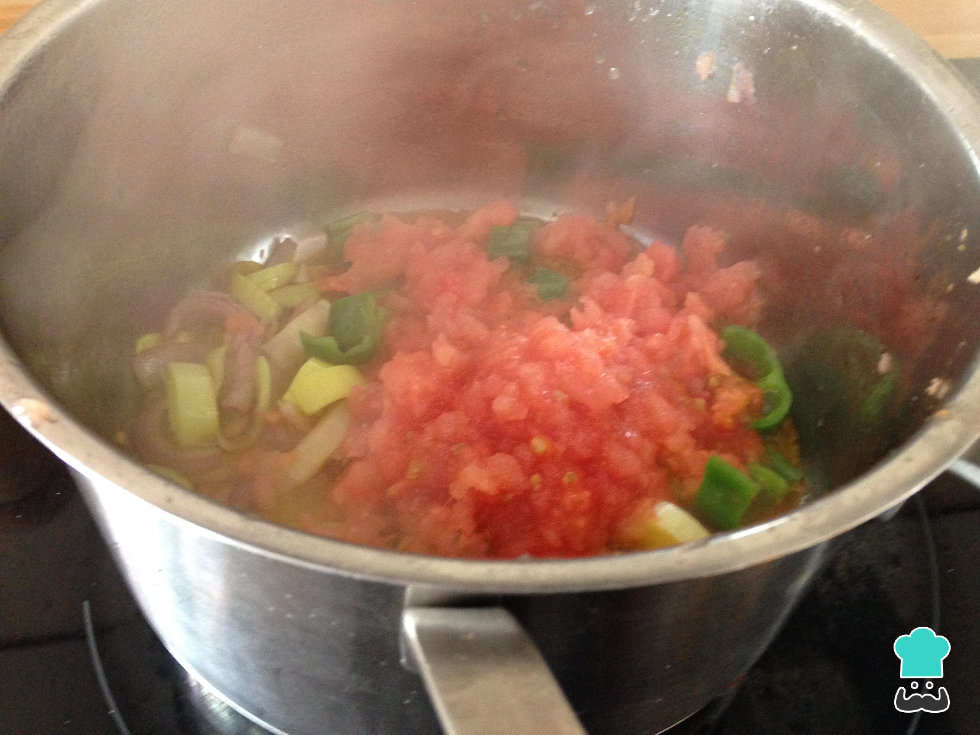 Em seguida, adicione o tomate ralado (também pode ser usado em lata). Junte um pouco mais de sal e pimenta e cozinhe por 3 minutos.
