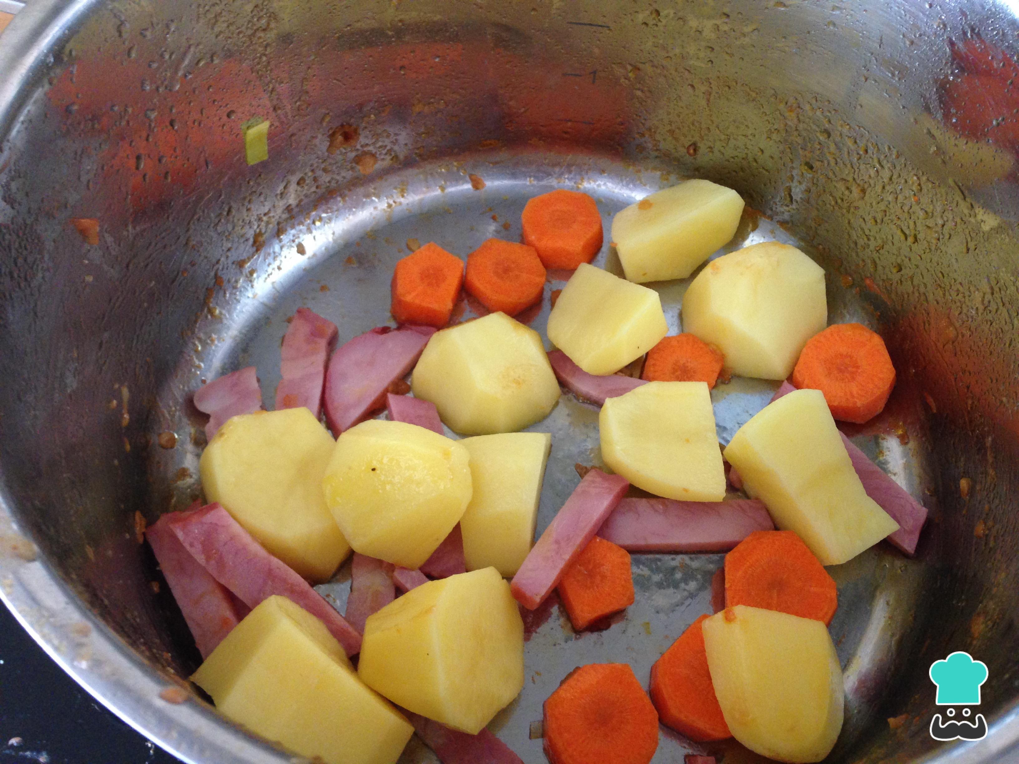 Na mesma panela, adicione um pouco mais de óleo e refogue as batatas, as cenouras e o bacon. Os legumes devem ter sido lavados, descascados e cortados previamente em rodelas e o bacon em tirinhas médias.