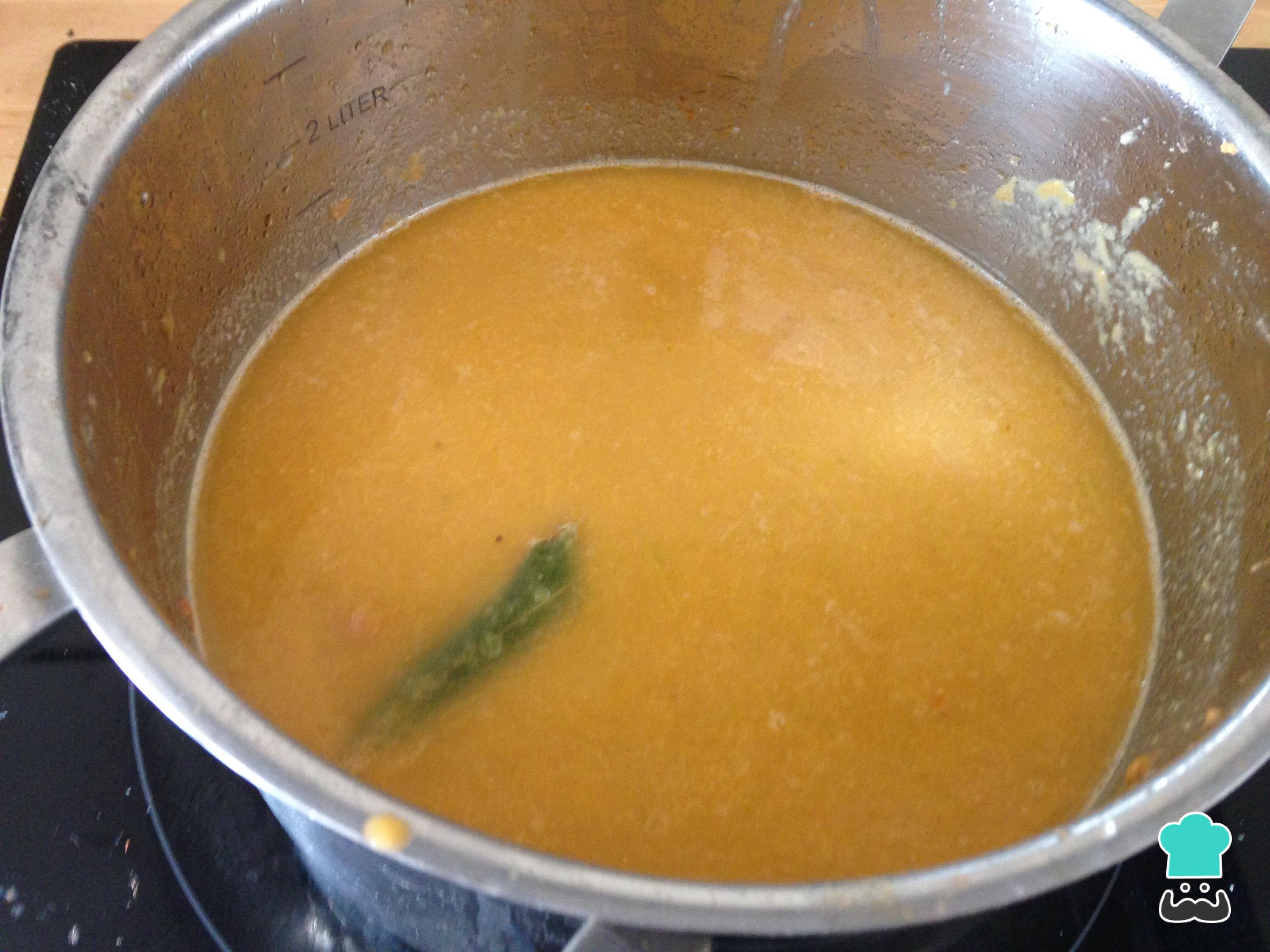 Adicione os legumes batidos, o louro e 4 xícaras de água. Junte um pouco de sal e cozinhe até que as batatas estejam macias.