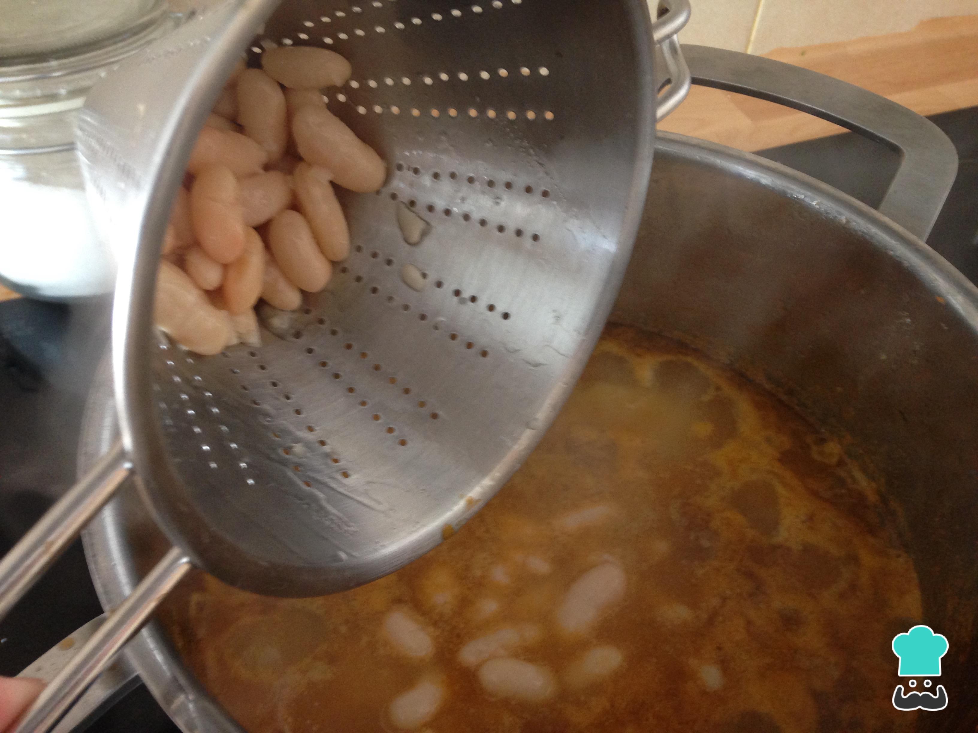 Finalmente, adicione o feijão branco previamente lavado e escorrido. Cozinhe 2 minutos e o prato está pronto para servir.
