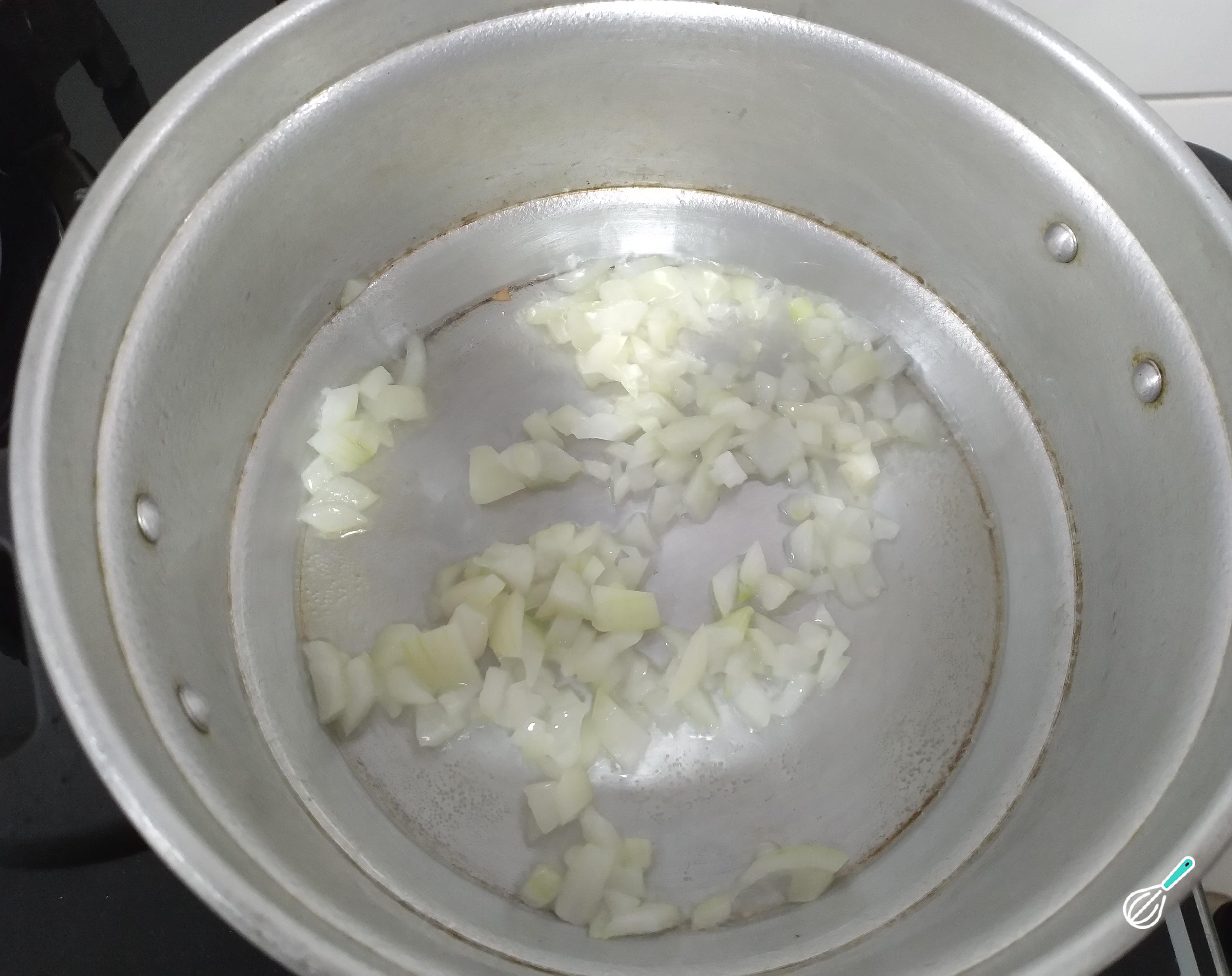 Enquanto o feijão cozinha, em uma panela coloque óleo e refogue a cebola. Deixe que ela solte líquido. Mexa bem.