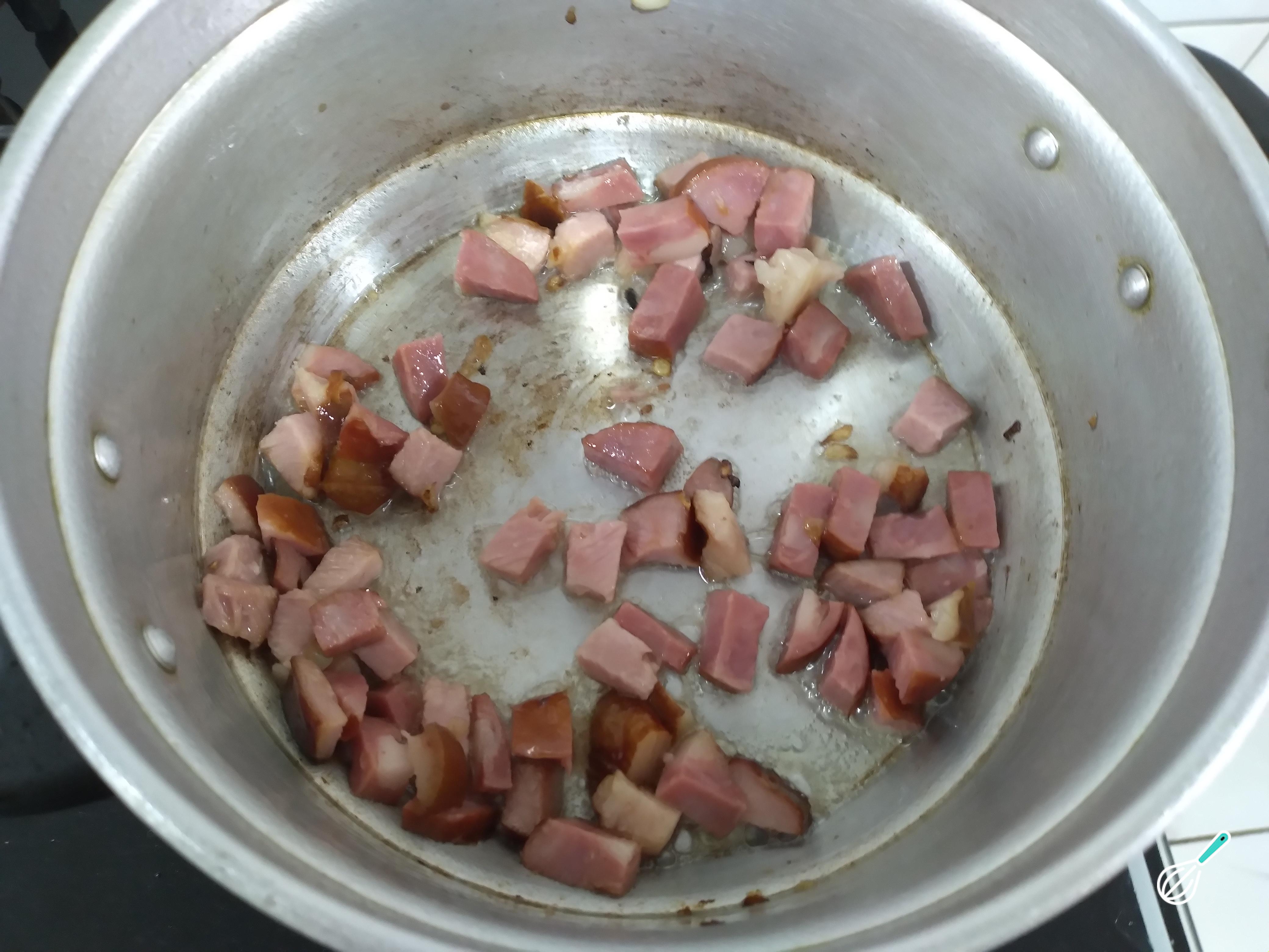 Depois de refogar bem a cebola, retire a mesma da panela para que não queime. Coloque em um recipiente e reserve a cebola. Na mesma panela coloque o bacon e a calabresa picados. Acrescente um pouco de óleo de soja e deixe fritarem. Depois que já estiverem fritos coloque novamente a cebola e reserve.