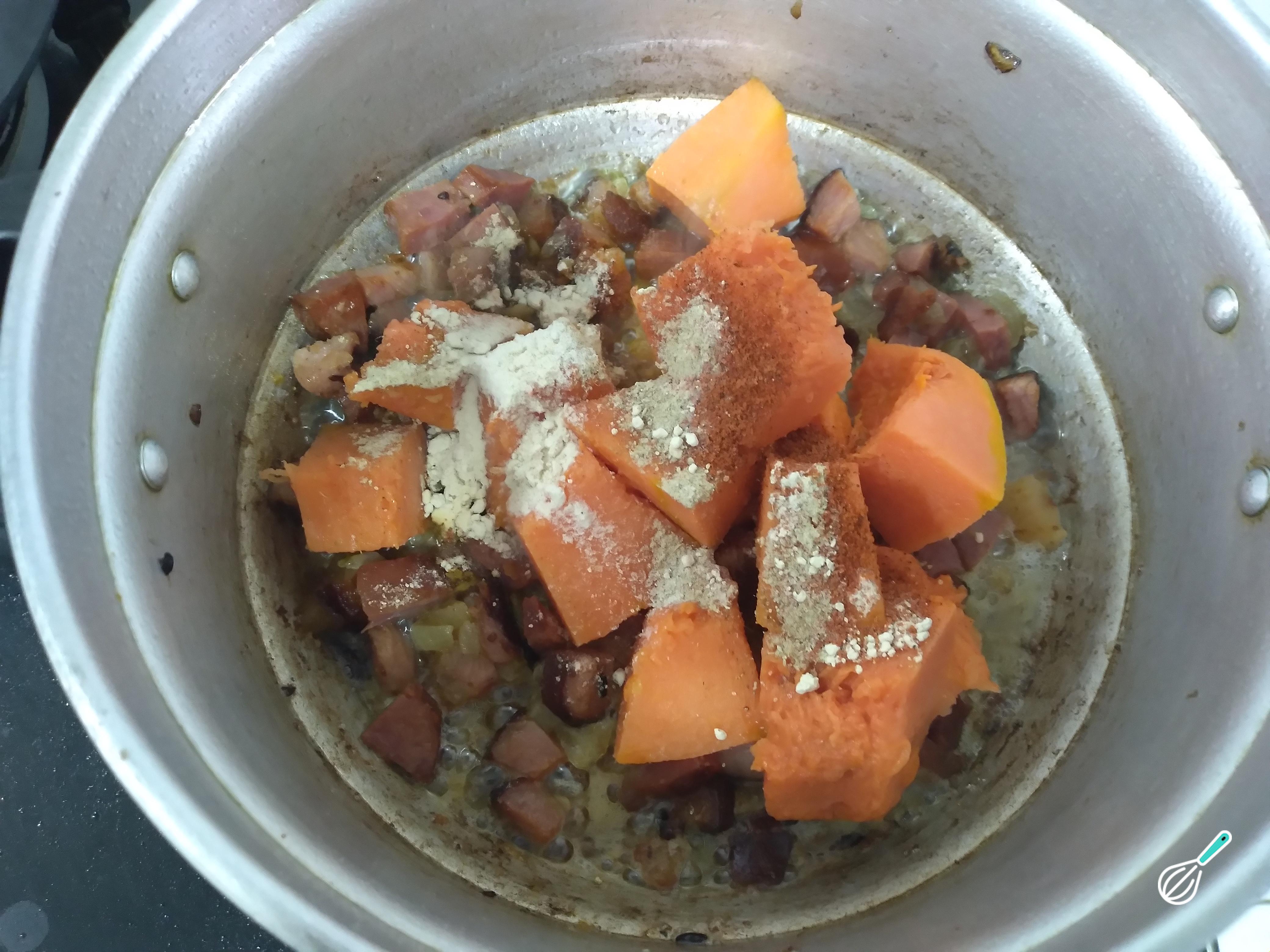 Com o feijão já cozido, acrescente a panela com a linguiça e o bacon, a abóbora cozida e os temperos de sua preferência. Acrescente pimenta e sal. Deixe que refogue um pouco para absorver os sabores. Mexa com cuidado para não desmanchar a abóbora.