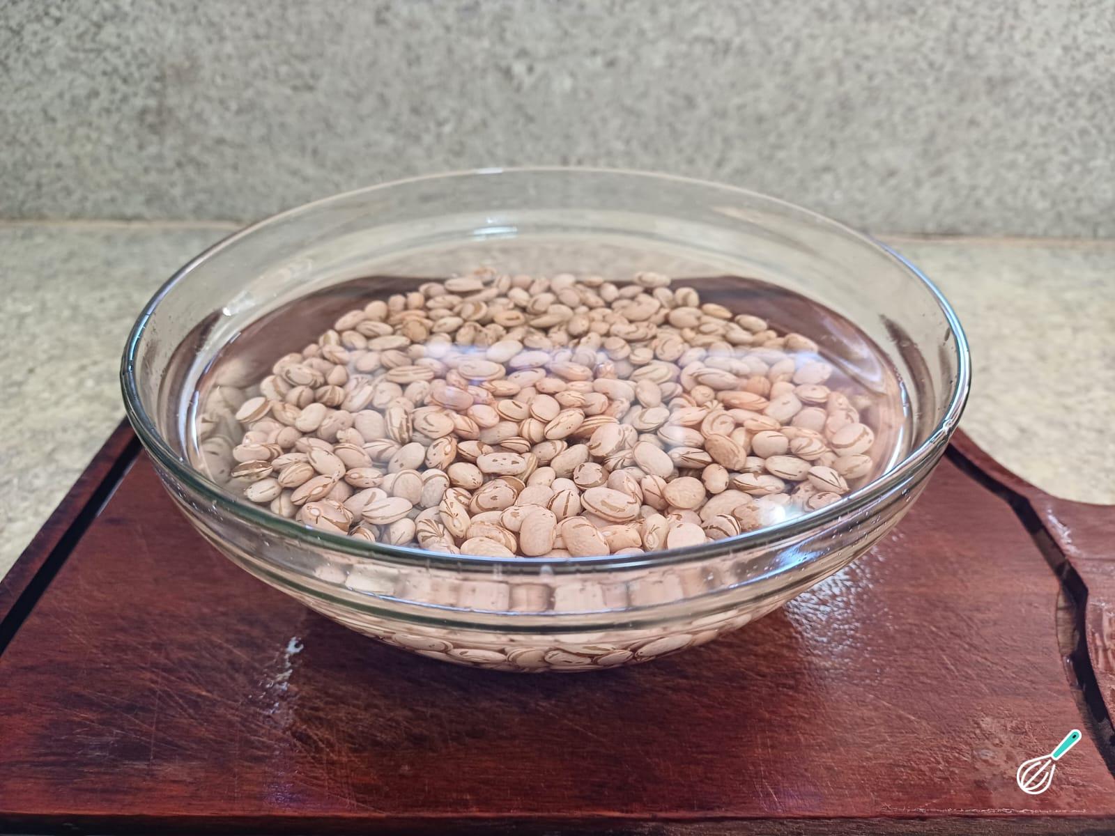 Lave bem os grãos de feijão em água corrente, peneire essa água e coloque em uma vasilha. Cubra novamente os grãos com água e deixe de molho pelo menos 4 horas ou de um dia para o outro.