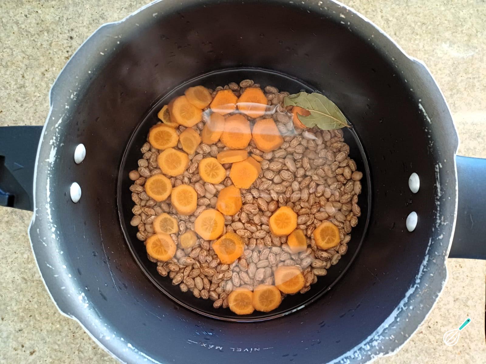 Descarte a água do molho, e disponha o feijão em uma panela de pressão, juntamente com a cenoura picada e as folhas de louro. Despeje a água para o cozimento.