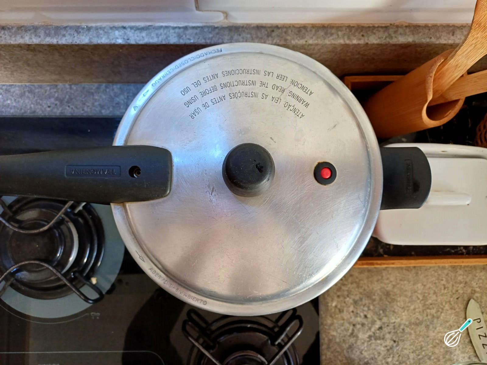Tampe a panela e leve ao fogo até pegar a pressão. Assim que pegar a pressão, abaixe o fogo e deixe cozinhando por 20-25 minutos.