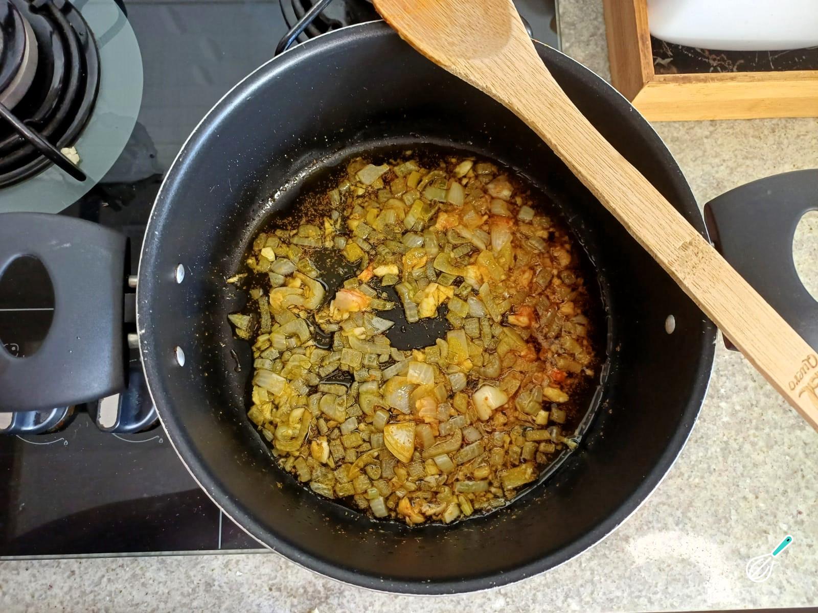 Em uma panela grande, aqueça o óleo e adicione a cebola, o alho e o colorau e deixe refogando até começar a dourar.