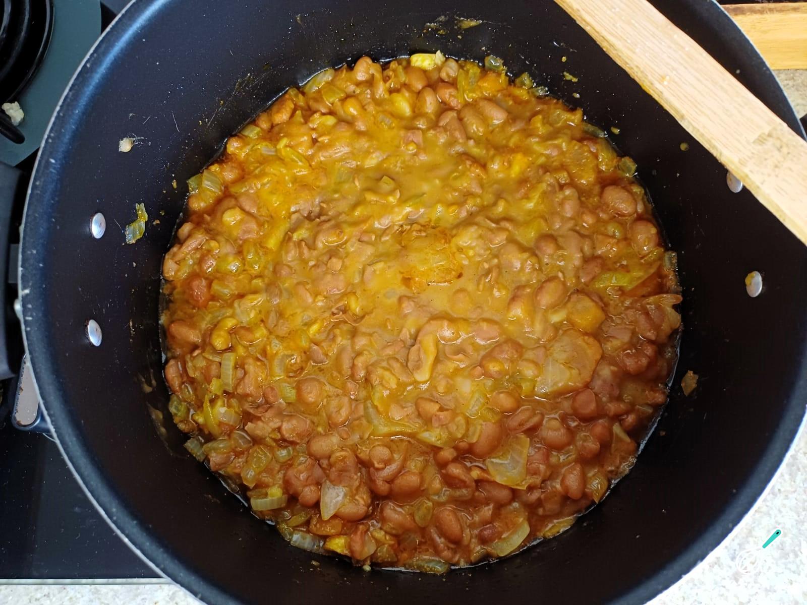 Acrescente duas conchas de feijão (somente os grãos), misture bem e vá amassando delicadamente até formar um purê.