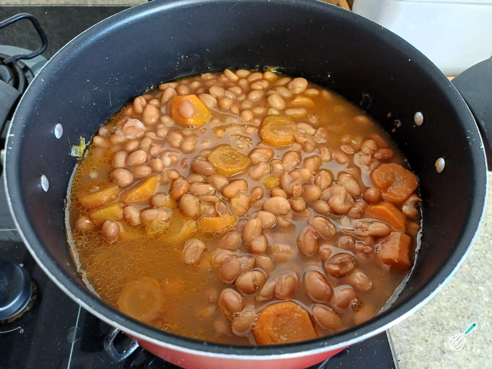 Após esse tempo, desligue o fogo e deixe a pressão sair naturalmente. Abra a panela com cuidado e verifique se o feijão e a cenoura estão macios.