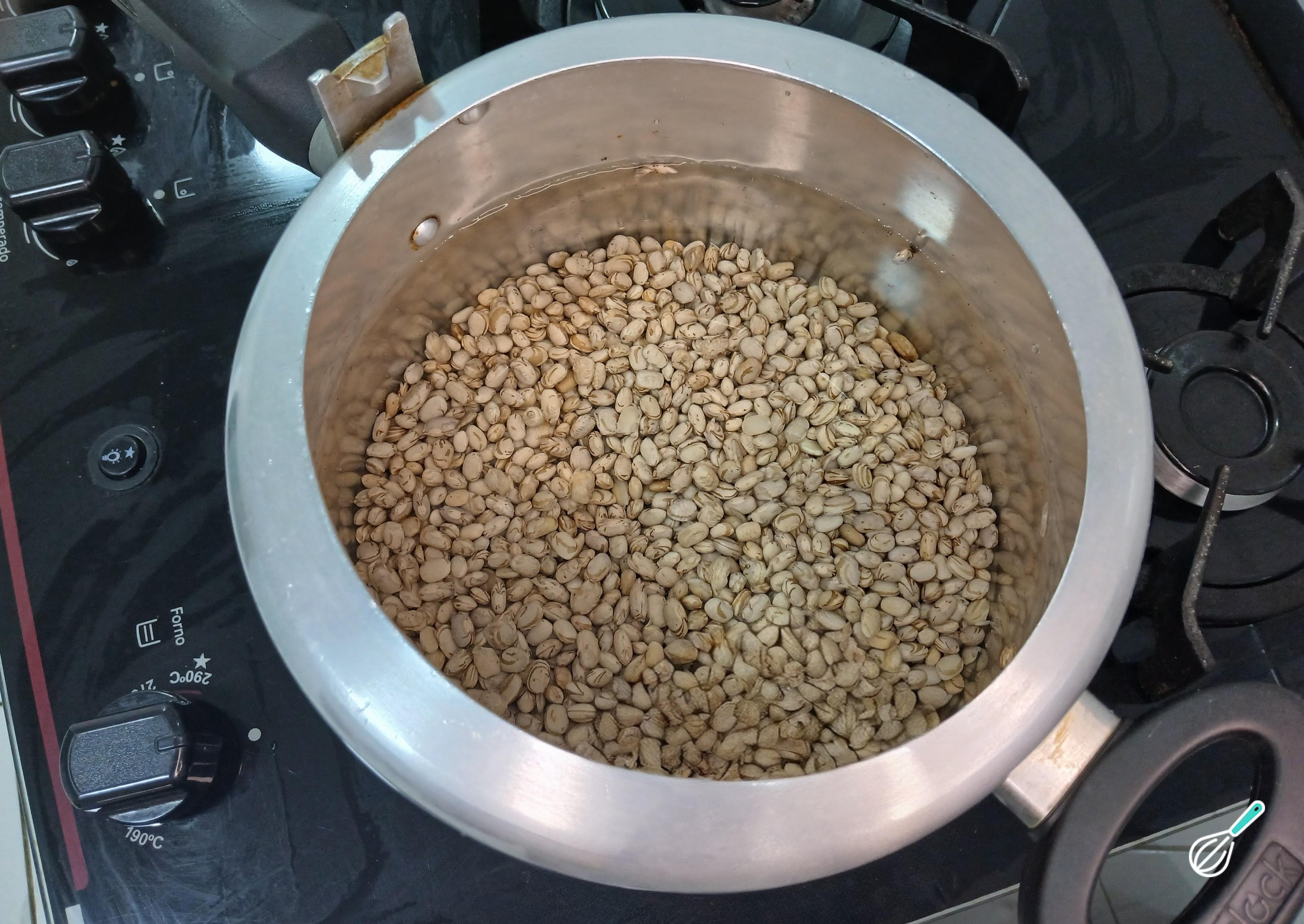 Feito isso, coloque o feijão na panela de pressão e cubra com água. Acenda o fogo e tampe a panela. Assim que pegar pressão, marque 25 minutos e depois disso deixe o ar sair naturalmente. Abra a panela.
