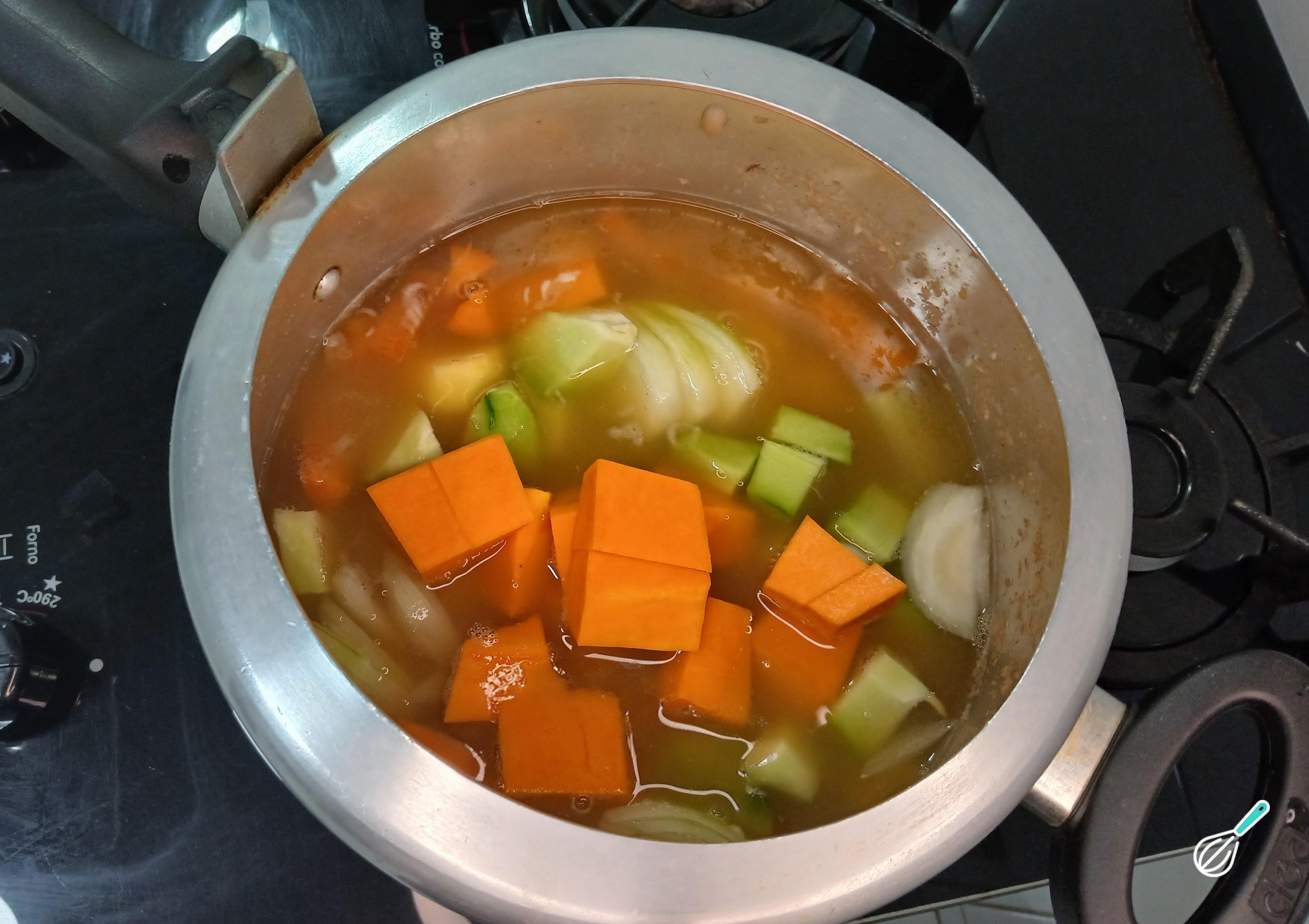 Depois de deixar o ar sair naturalmente, abra a panela de pressão e coloque os legumes. Reserve somente os temperos, sal e cebolinha verde e salsinha. Reserve também a cebola branca cortada em cubinhos.