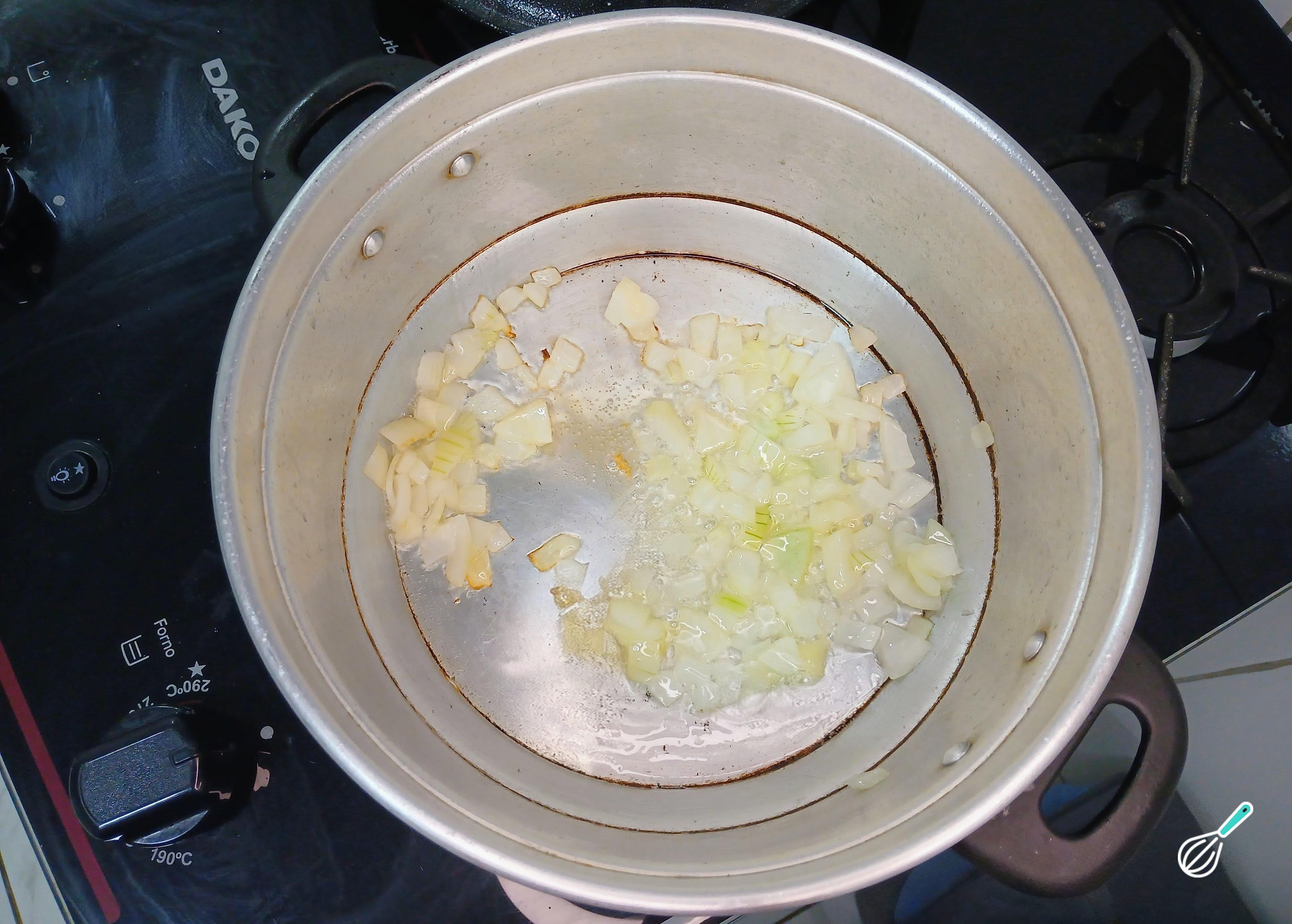 Enquanto o feijão cozinha, em uma panela, coloque o óleo e a cebola branca cortada em cubos para refogar. Deixe que refoguem e mexa sempre para evitar que grudem no fundo da panela.