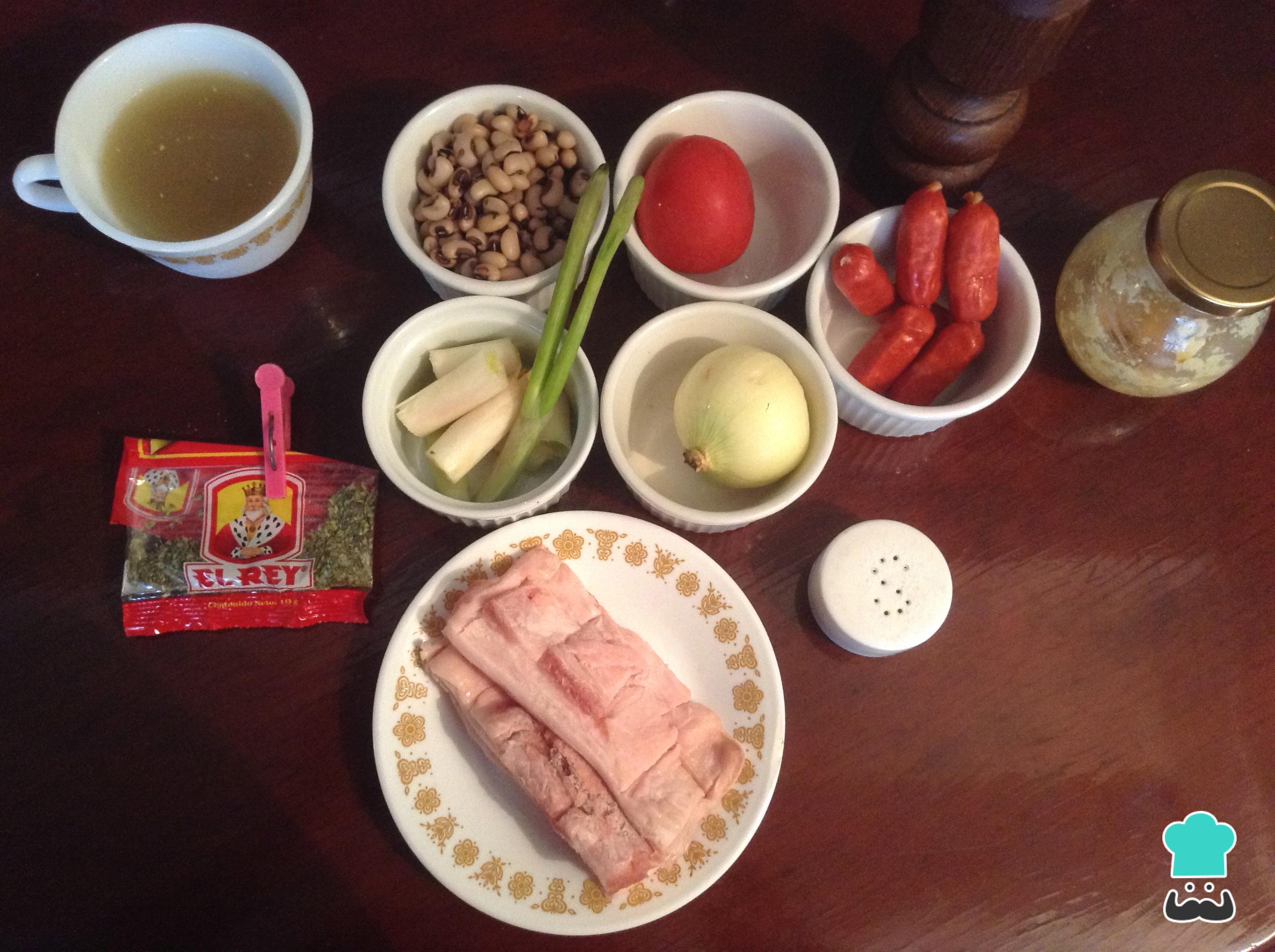 Reúna todos os ingredientes necessários para preparar esta receita de feijão com toucinho e linguiça.
