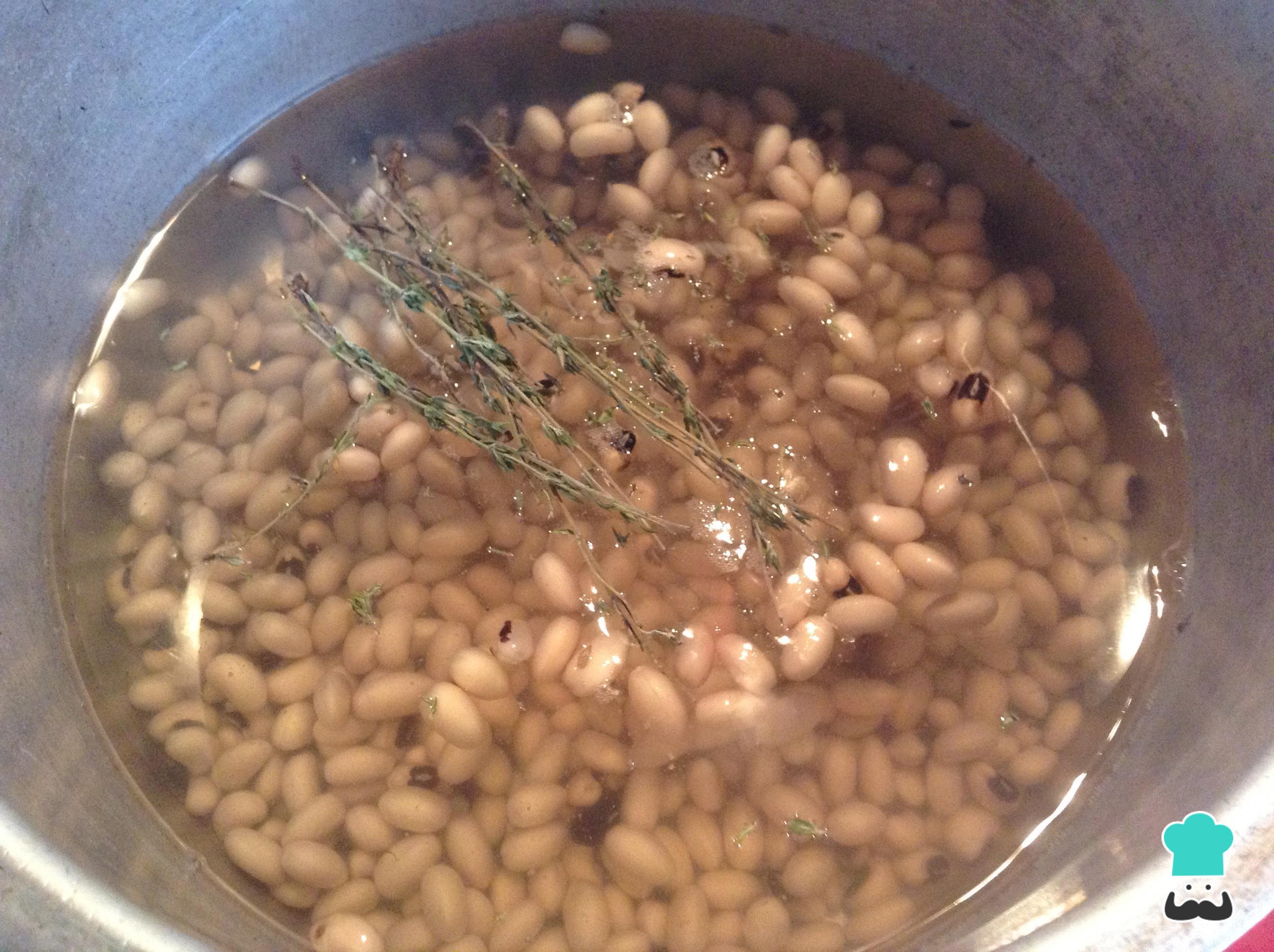 Se você preferir usar feijão cru, não se esqueça de o deixar de molho em água desde o dia anterior. Escorra e coloque em uma panela de pressão, cobrindo com água, temperando com sal e alguns ramos de tomilho. Cozinhe os feijões em fogo médio durante cerca de 20 minutos, escorra e reserve.