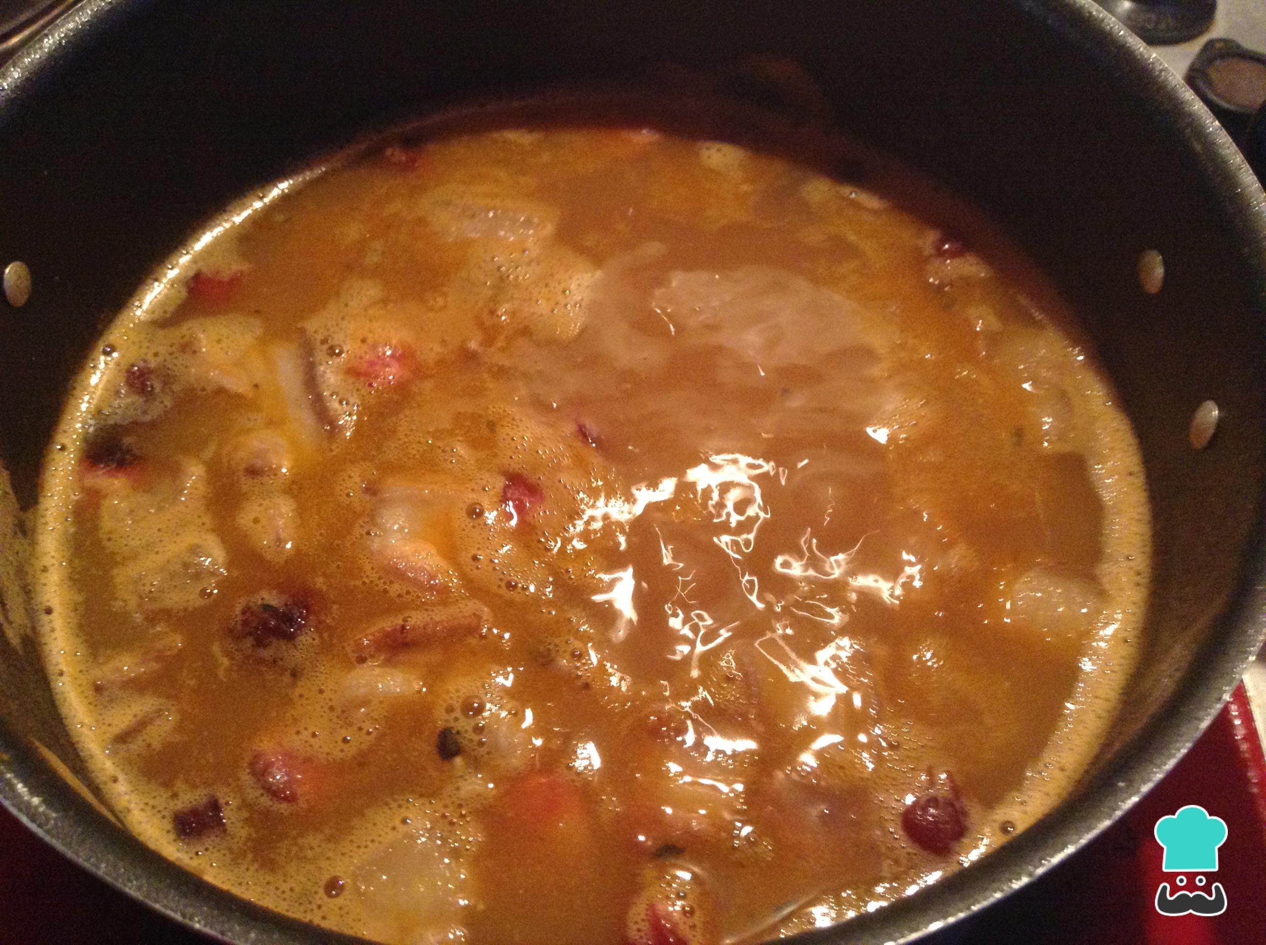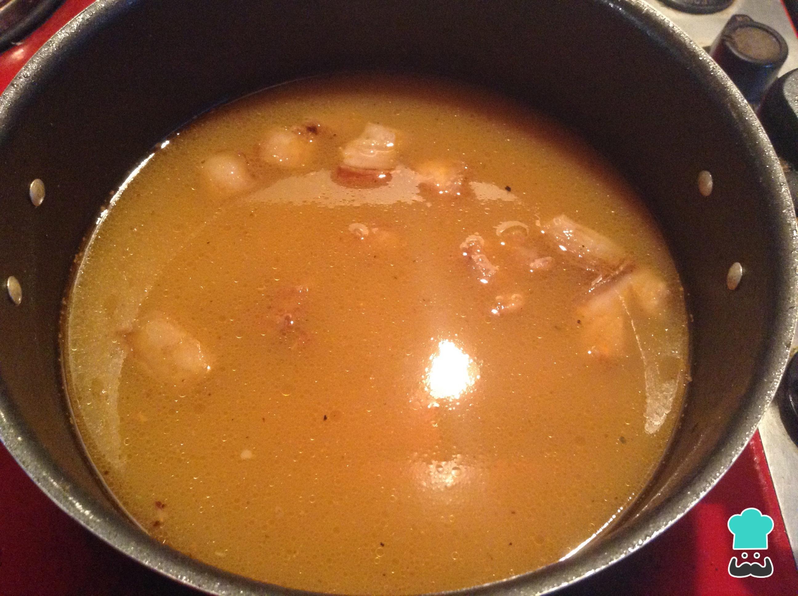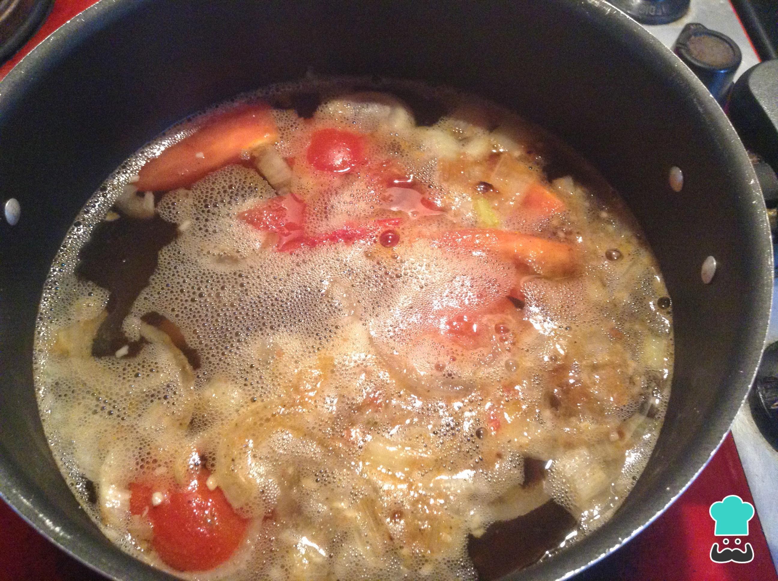 Assim que os legumes anteriores estiverem murchos, acrescente o caldo de galinha e uma xícara de água. Cozinhe esta base da receita em fogo médio durante 20 minutos, e desligue o fogo.