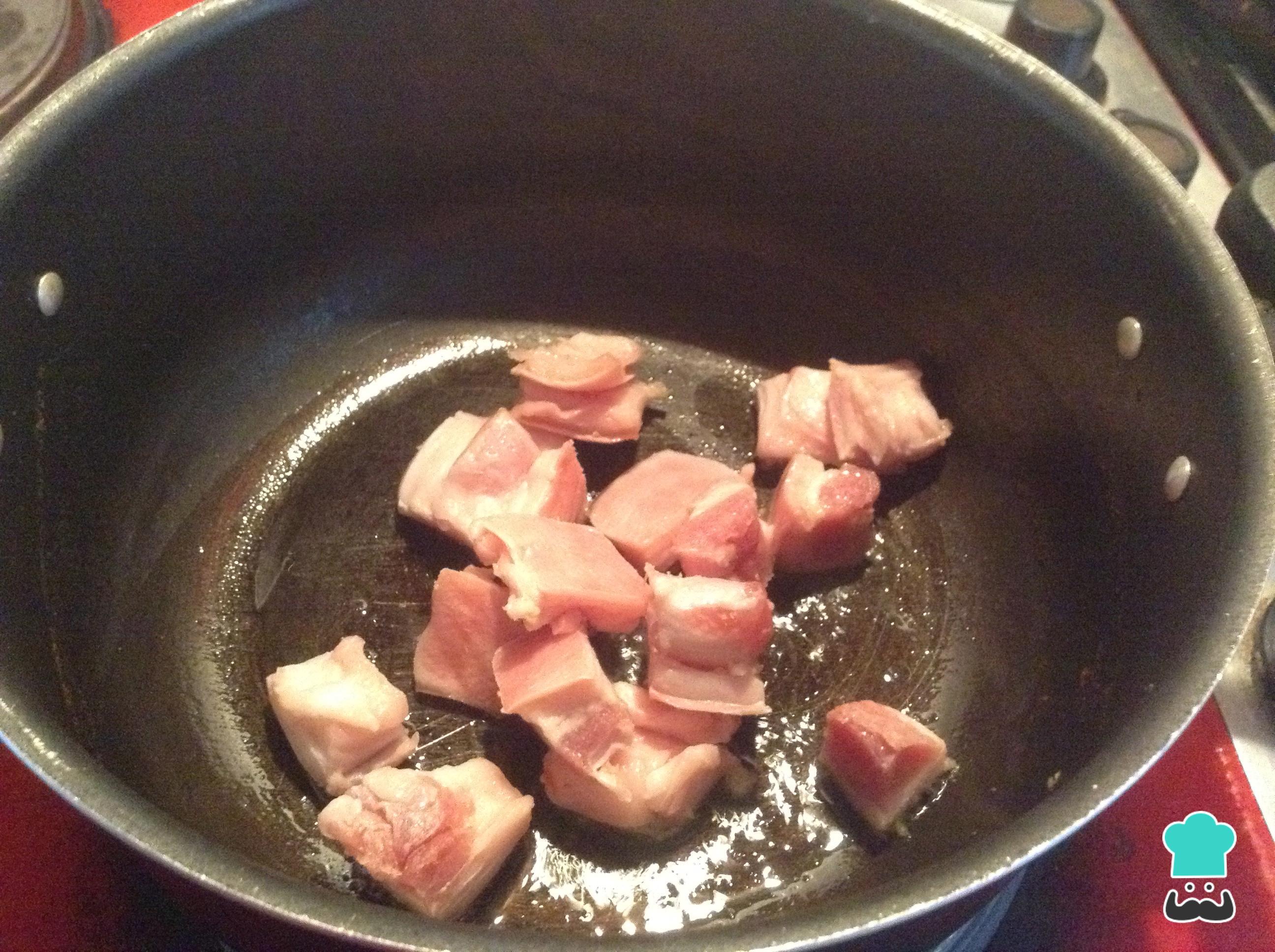 Numa outra panela ou frigideira funda, continue preparando o feijão com toucinho e linguiça: corte o toucinho em pedaços e frite-o na própria gordura até que fique dourado.