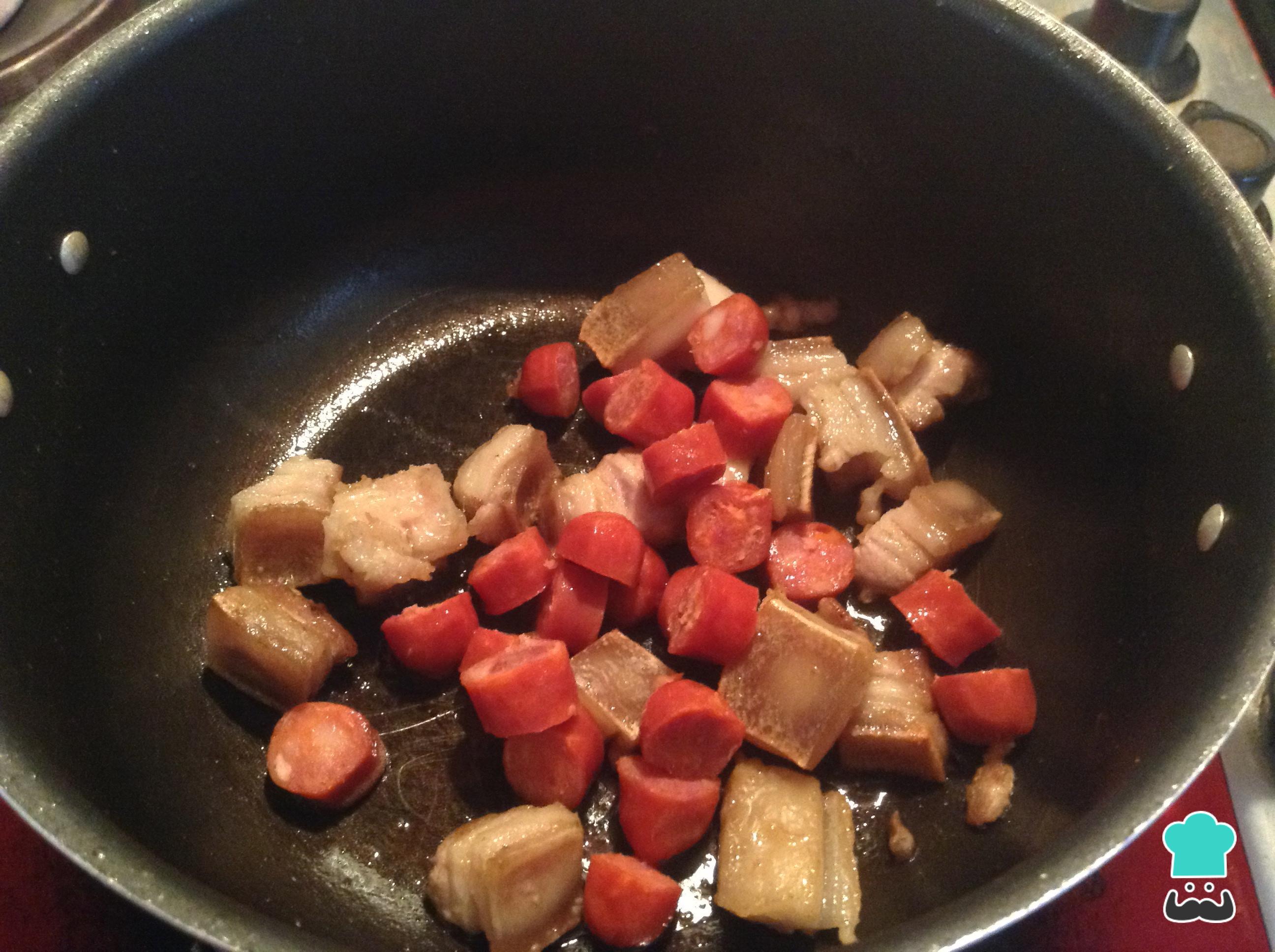 Quando o toucinho estiver dourado, acrescente a linguiça cortada em rodelas, frite por 5 minutos.