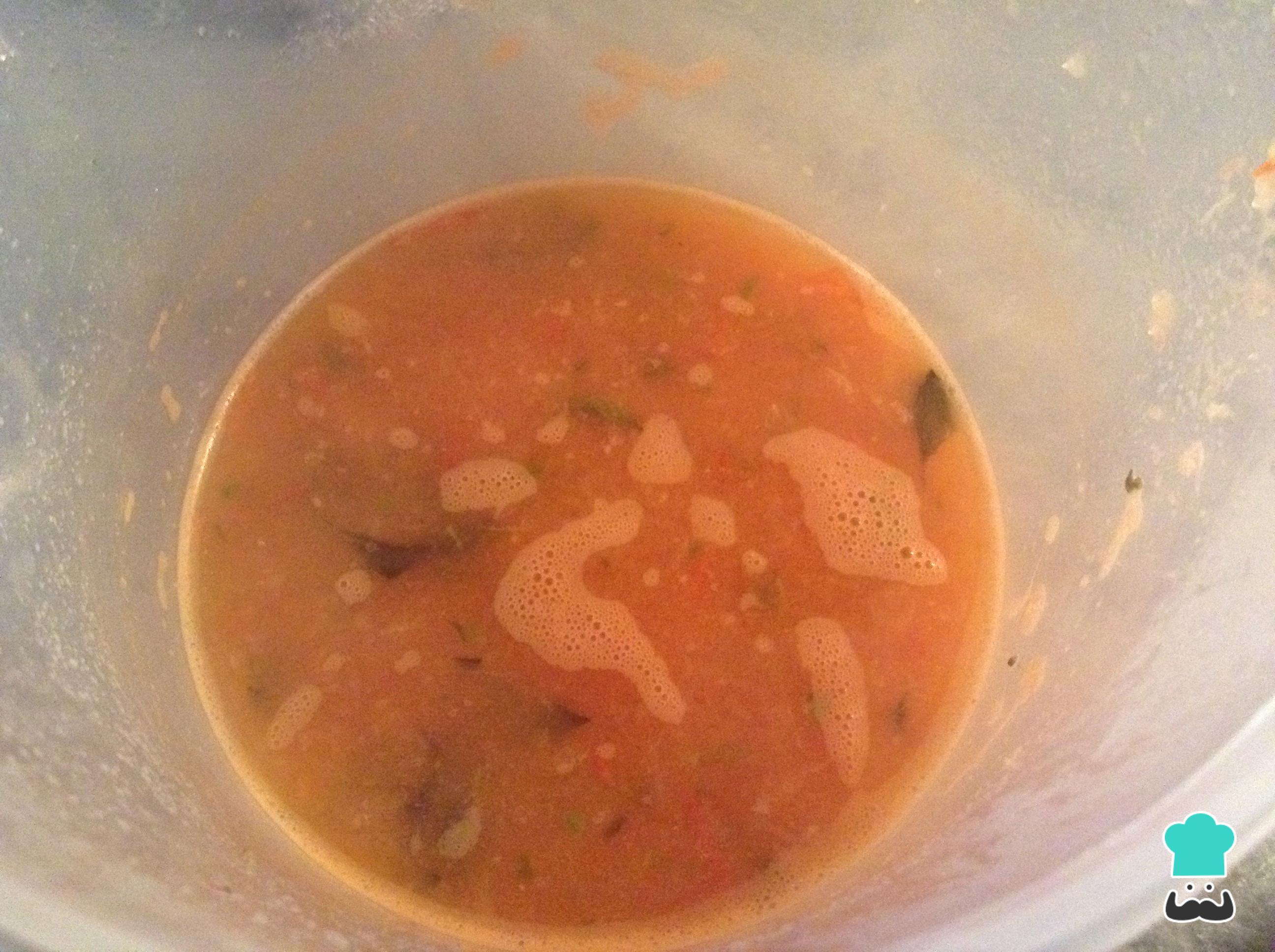 Assim que a base da receita de feijão com toucinho e linguiça estiver morna, bata-a no liquidificador ou com um mixer, de forma a obter um caldo sem pedaços.