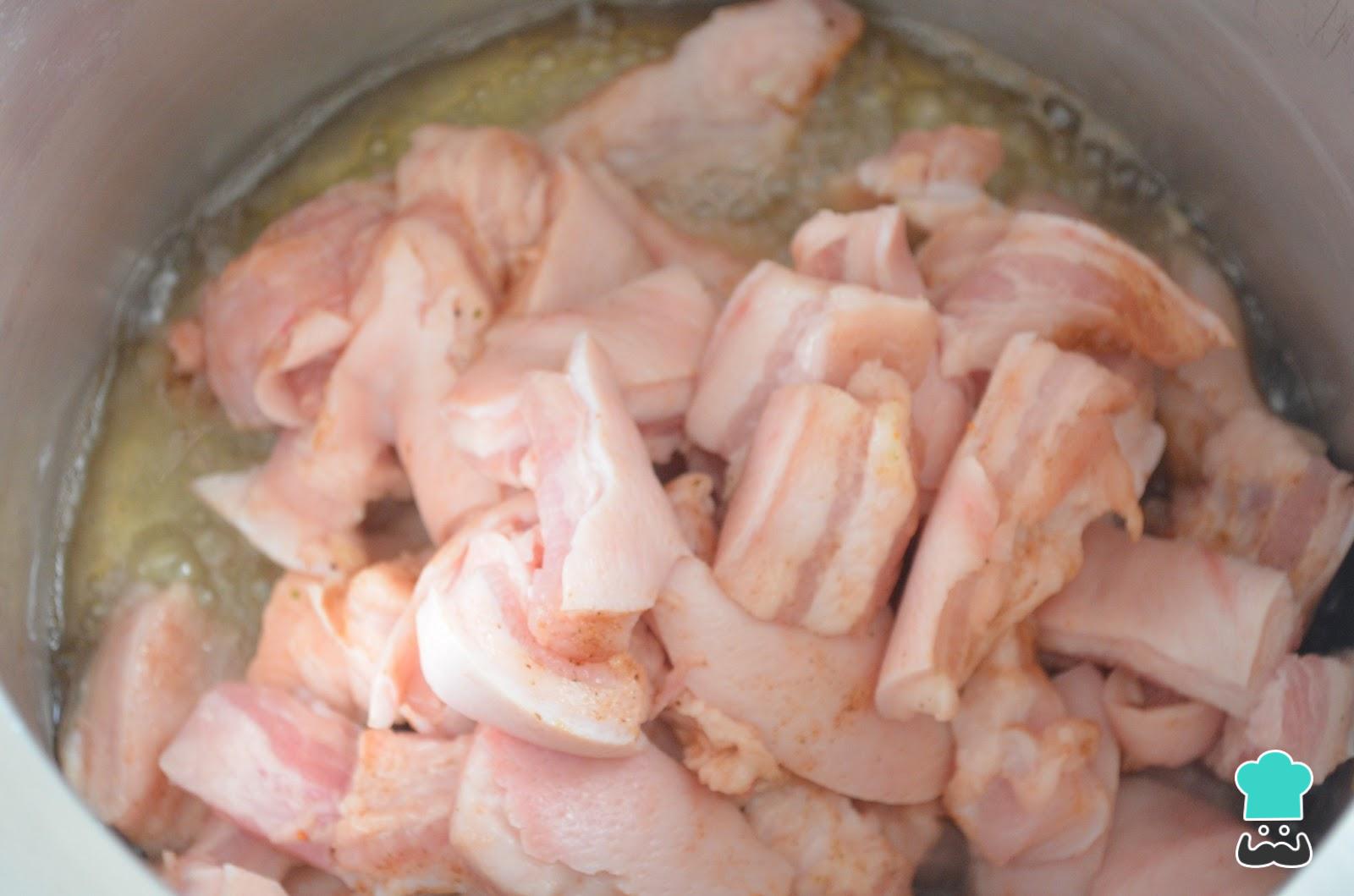 Quando a cebola estiver transparente, acrescente o toucinho cortado em pedaços, a linguiça e a páprica, baixe o fogo e deixe fritar até as carnes ficarem douradas.