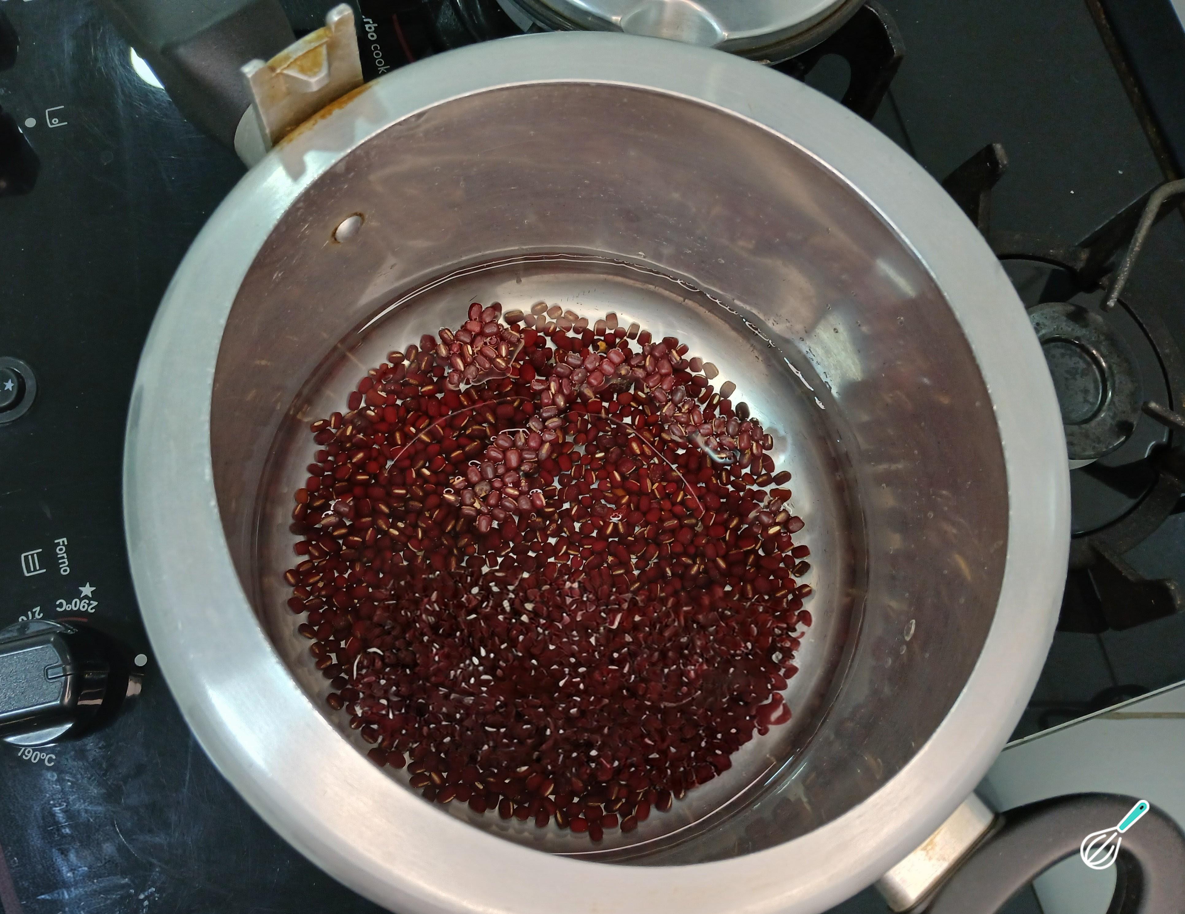 Comece separando os ingredientes para o preparo do feijão doce japonês. Separe o feijão azuki - precisa ser esse tipo de feijão para que a receita dê certo. Separe também a água para cozinhar o feijão, uma pitada de sal e o açúcar.