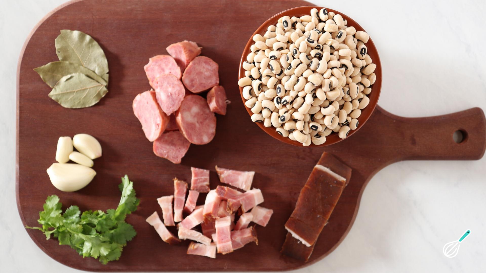 Vamos começar separando os ingredientes. Aqui o nosso lema é desperdício zero e, como vocês podem ver na foto, o couro do bacon também é um dos ingredientes que usamos para dar sabor ao nosso feijão fradinho. O coentro é opcional, mas nós somos do time 'Amo Coentro' e quase sempre finalizamos as receitas com ele!