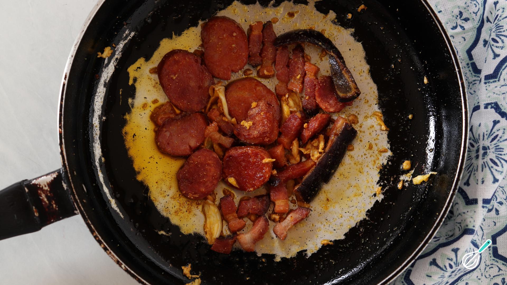 Enquanto isso prepare o refogado em uma frigideira, começando pelo bacon e a linguiça. Quando estiverem bem dourados, acrescente o alho (que você pode passar por um espremedor ou picar com faca, você escolhe).