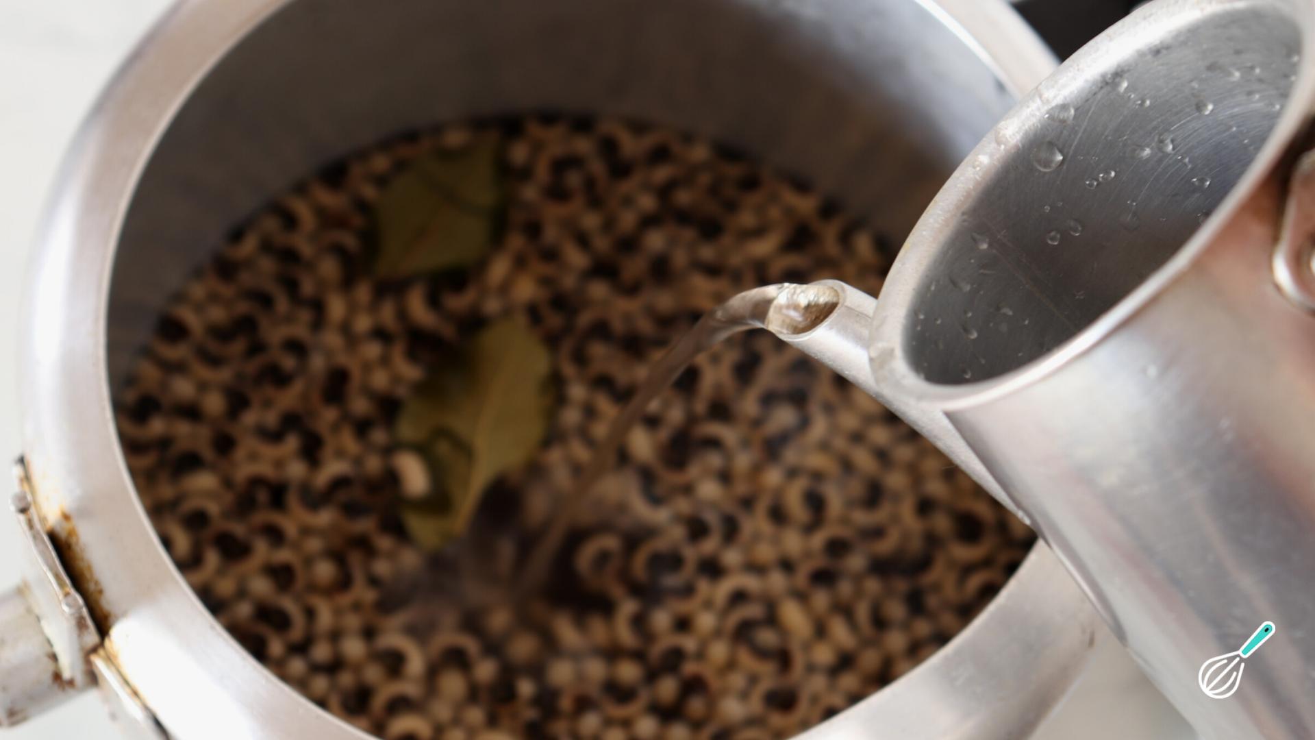 Coloque o feijão já lavado na panela de pressão e acrescente a água fervida e as folhas de louro.