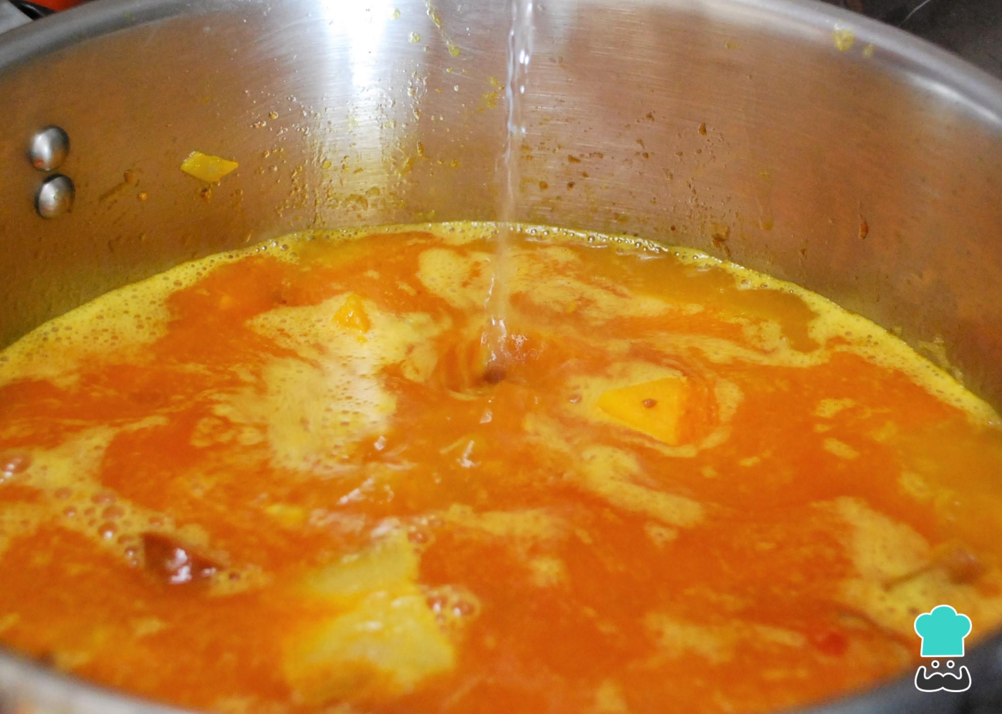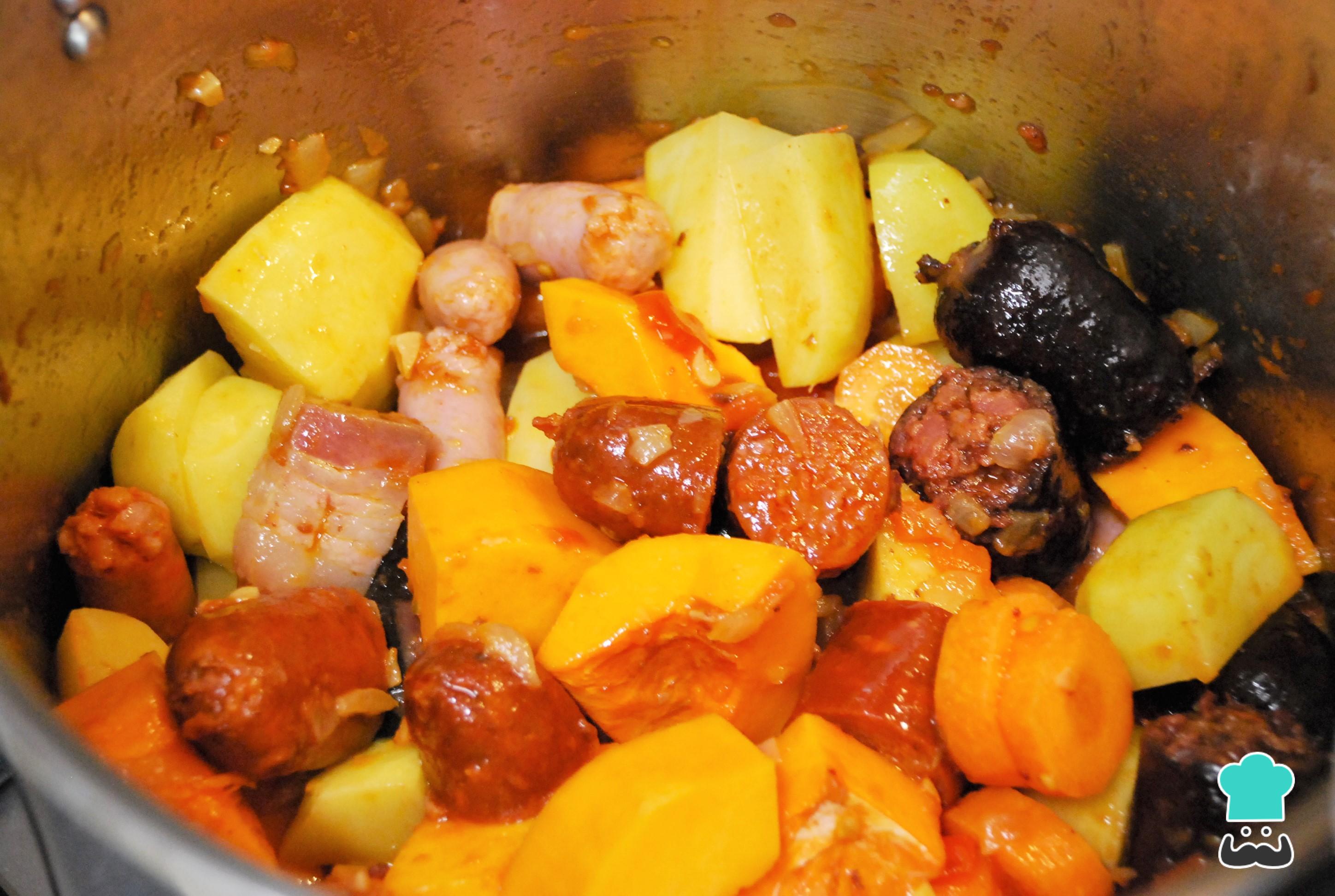Misture e, após alguns minutos, adicione as batatas, a abóbora e as cenouras. Volte a misturar, de forma a que todos os ingredientes fiquem envolvidos no guisado.