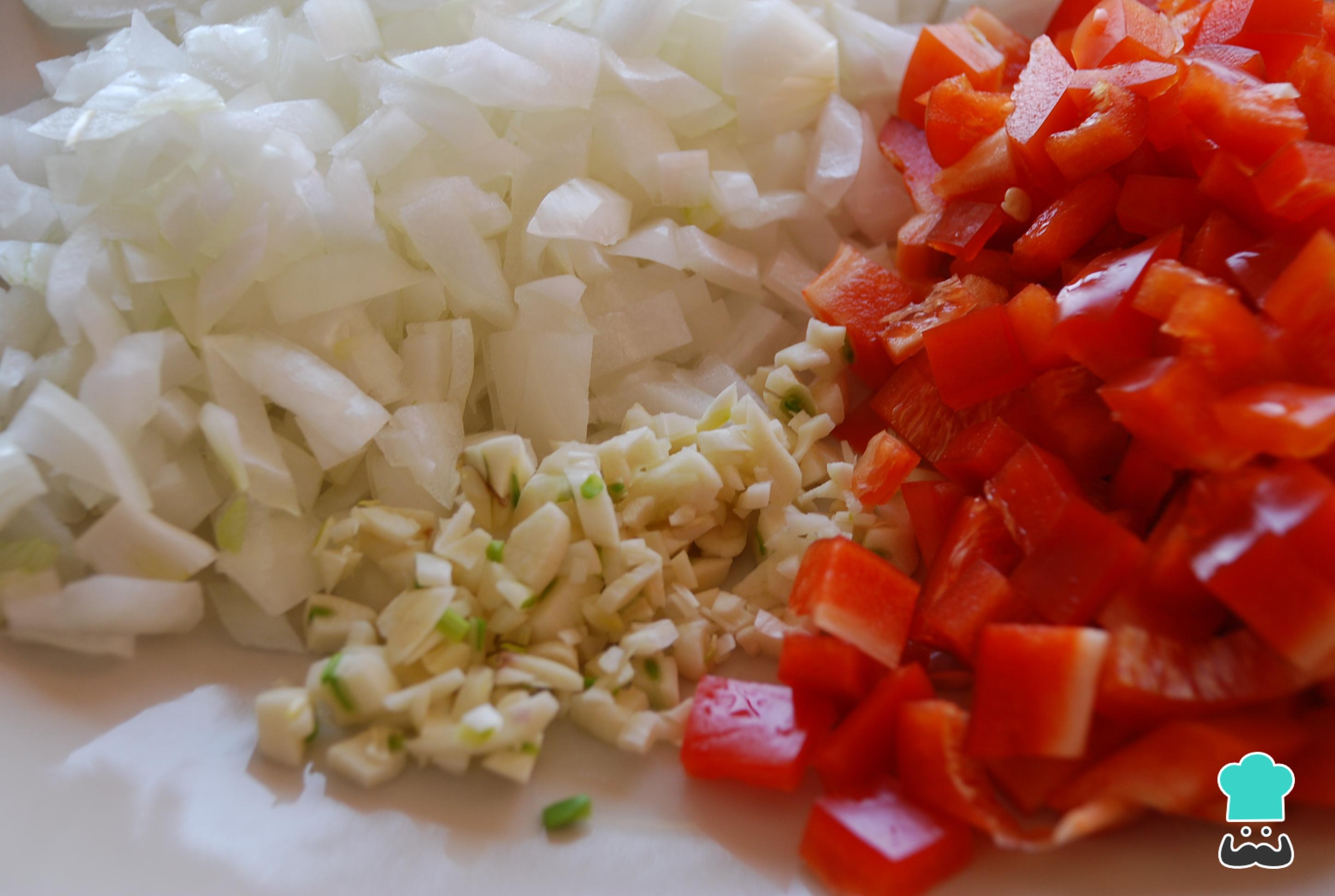 De seguida pique finamente os alhos, o pimentão e a cebola.