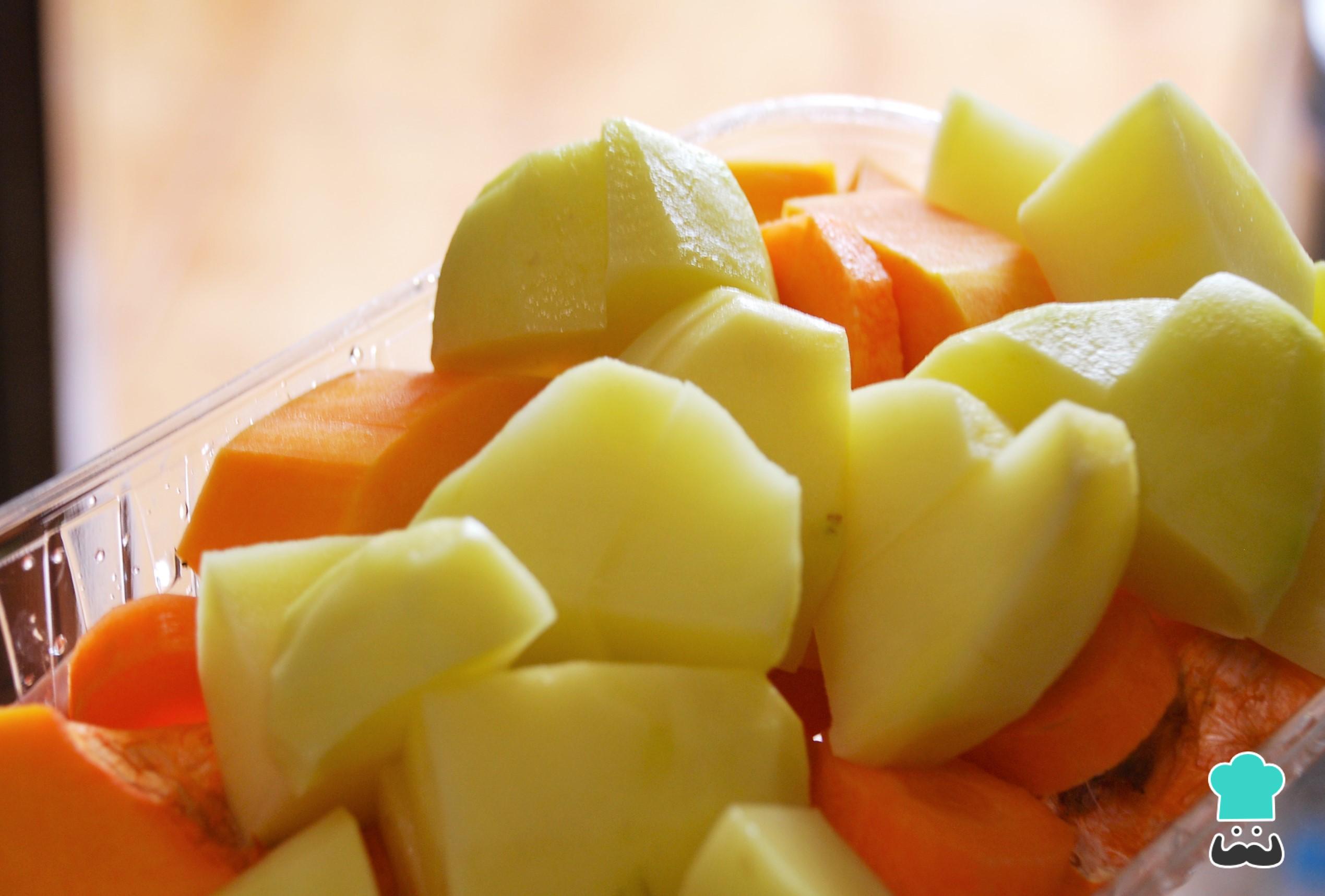 O passo seguinte desta receita de Feijão guisado com chouriço é descascar e cortar em pedaços a abóbora, as batatas e as cenouras.