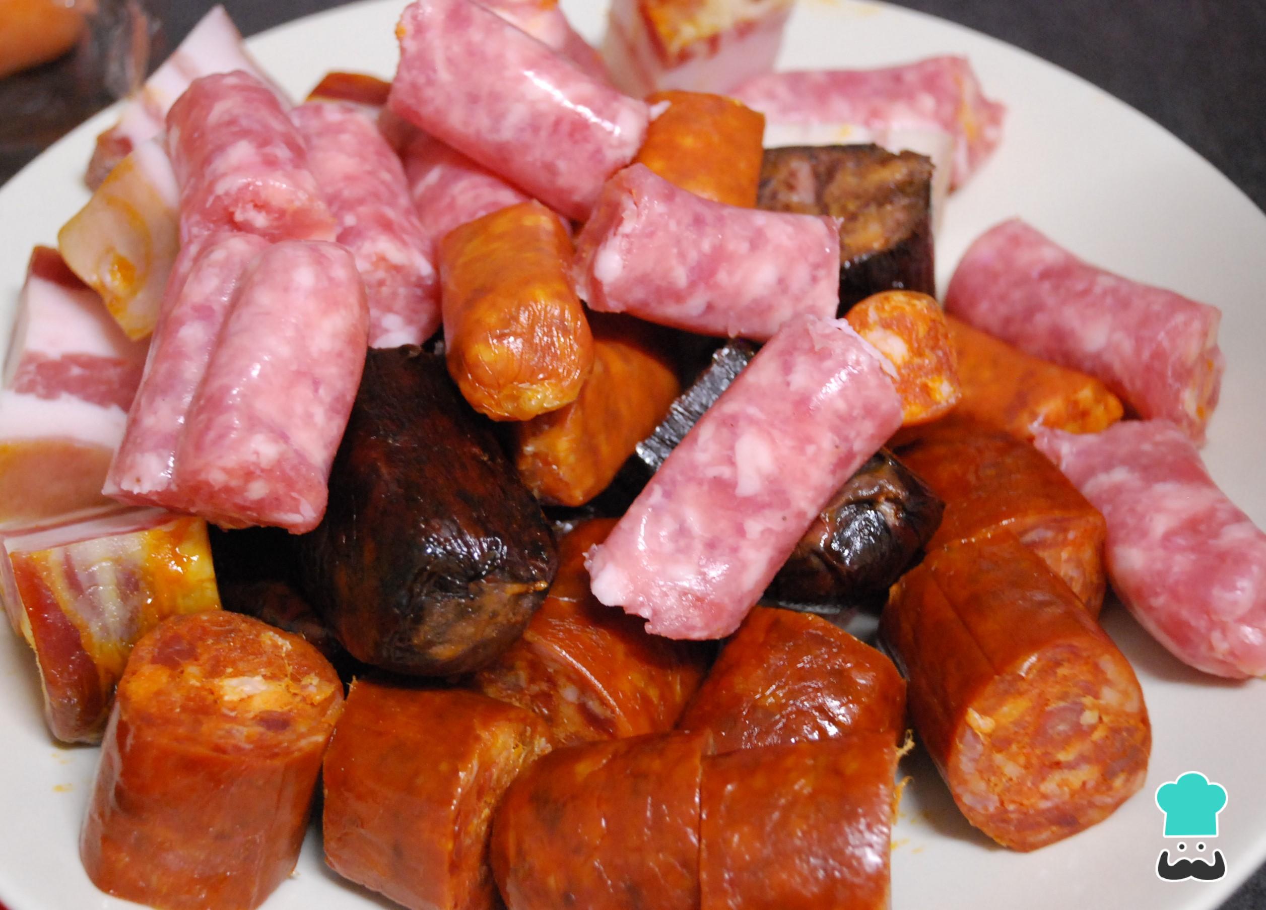 Corte também em pedaços todos os embutidos usados nesta receita: os chouriços, as morcelas, as salsichas e a linguiça.