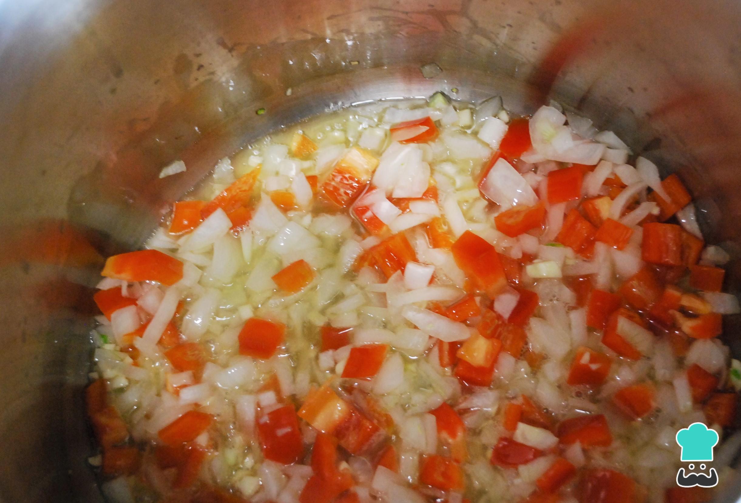 Leve ao fogo médio uma panela alta e prepare aí um guisado com um pouco de azeite, a cebola, o pimentão e o alho.