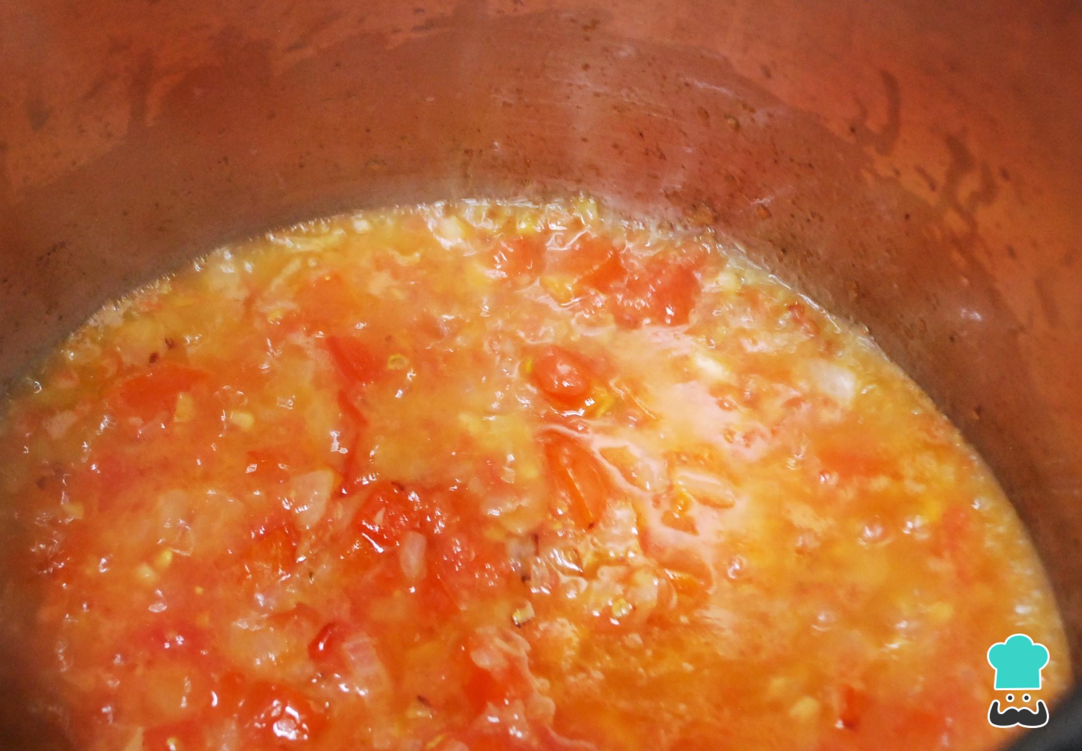 Quando a cebola ficar transparente, acrescente o tomate ralado e misture com os restantes ingredientes.