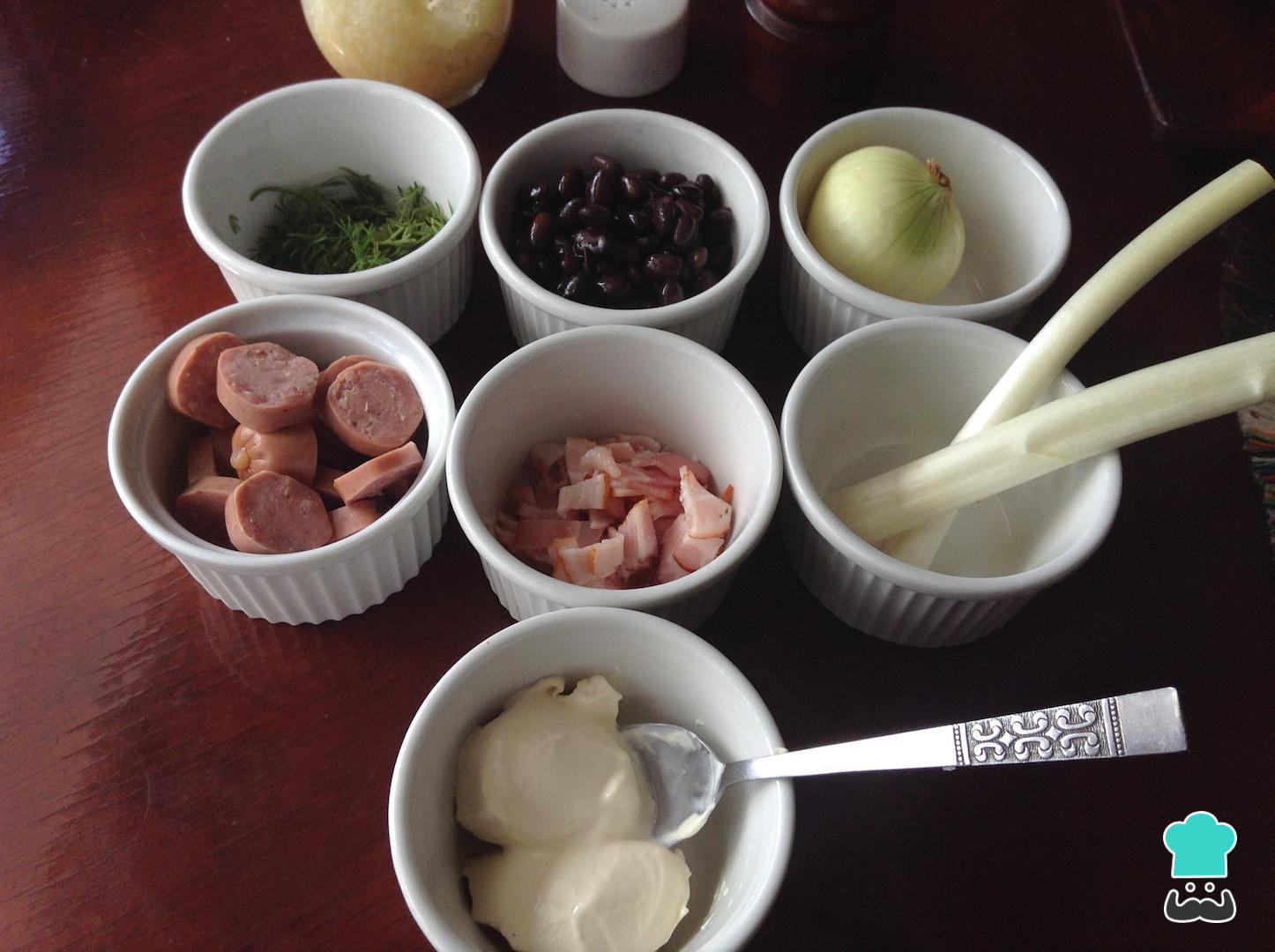 Para fazer esta receita de feijão, comece por juntar todos os ingredientes. Acima de tudo, lembre-se de guardar a água do cozimento do feijão.