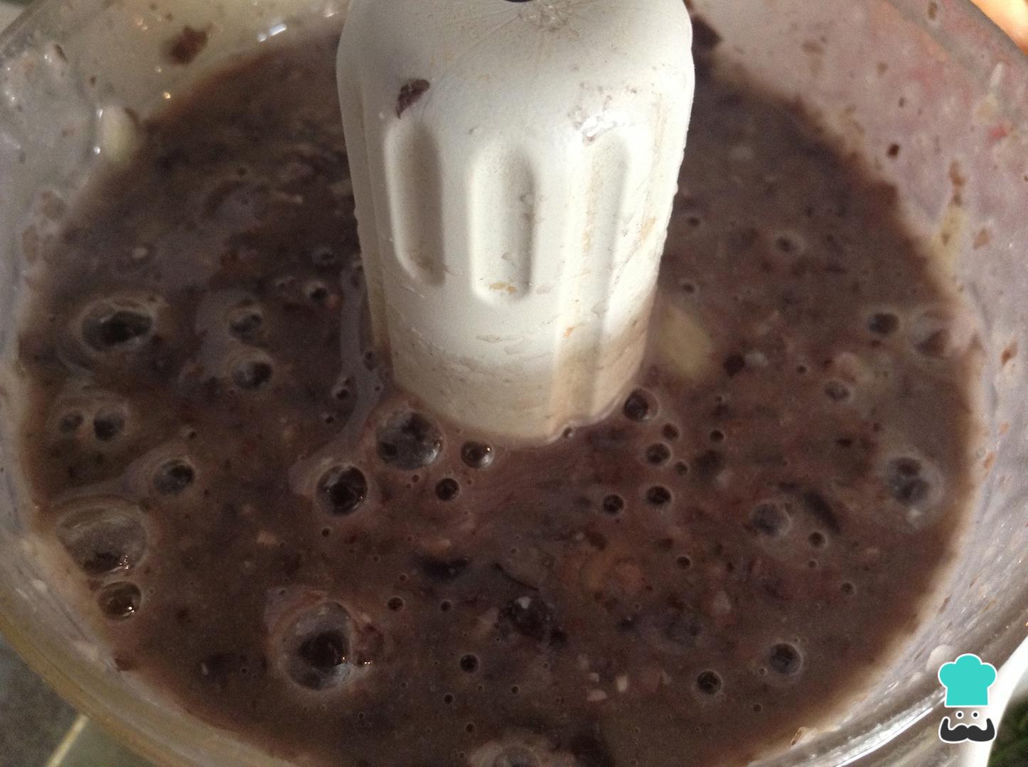 Coloque o feijão e a cebola no processador ou liquidificador e bata muito bem, até obter um purê como o da fotografia. Reserve.