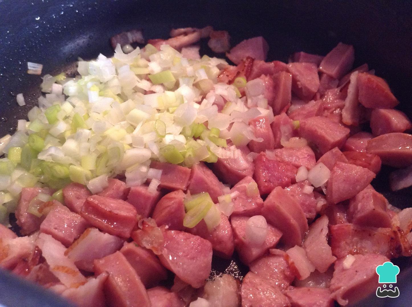 O passo seguinte do feijão preto com chouriço é levar uma panela ao fogo médio com o óleo de girassol e fritar o bacon e o chouriço, ambos cortados em pedaços. Quando começarem a dourar, adicione o alho-poró picado e cozinhe tudo junto.