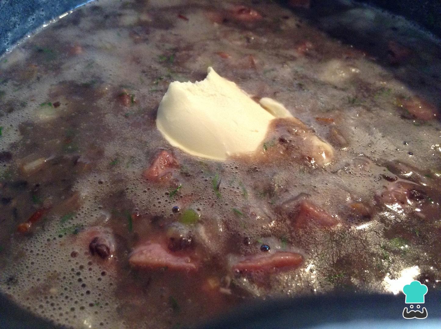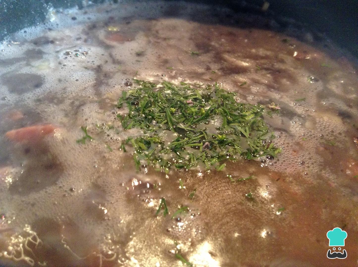 Depois de refogados os ingredientes, junte o puré de feijão e a água do cozimento do feijão. Adicione sal, pimenta do reino e pasta de alho a gosto e deixe cozinhar em fogo baixo durante 15 minutos. No final, adicione o coentro finamente picado.