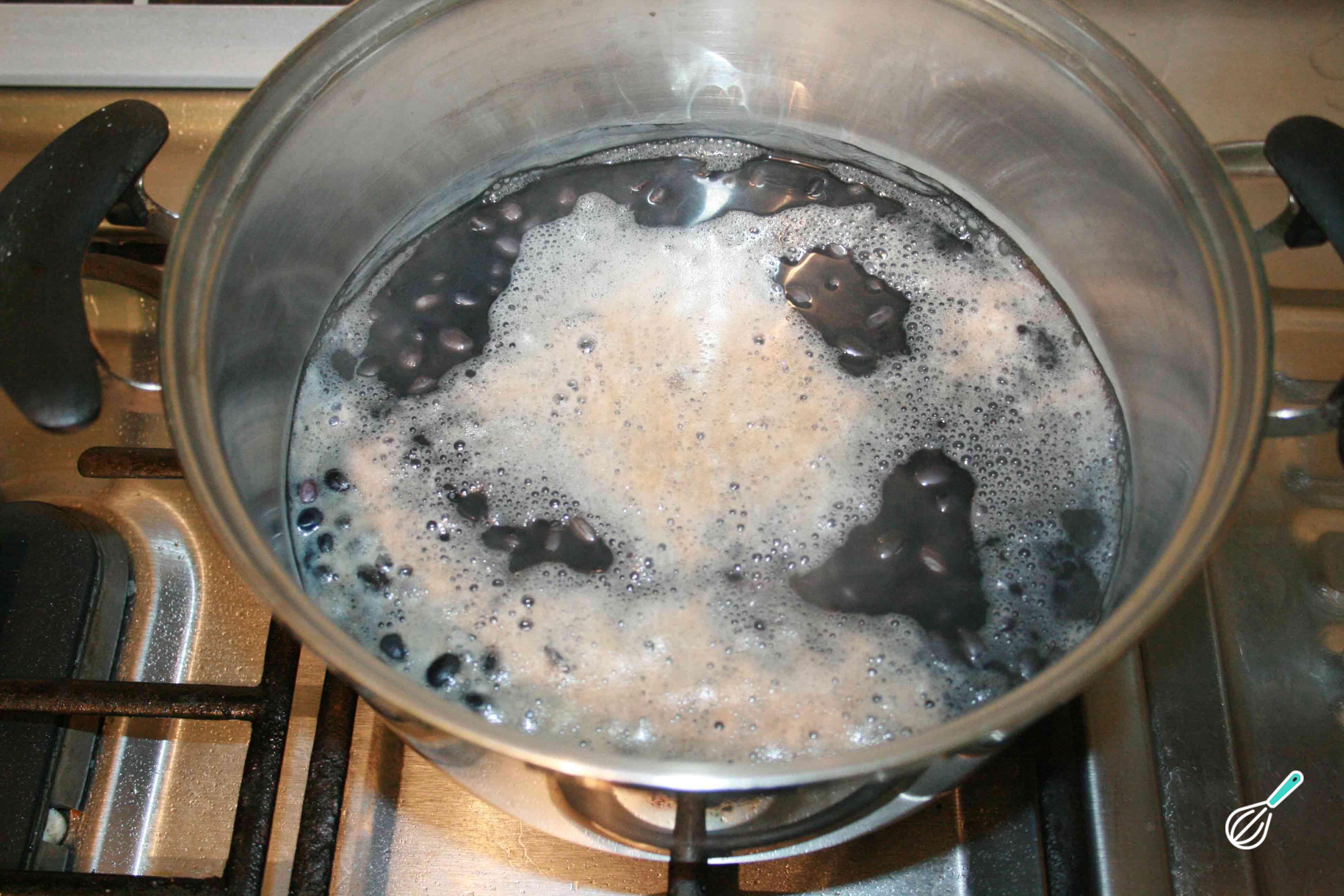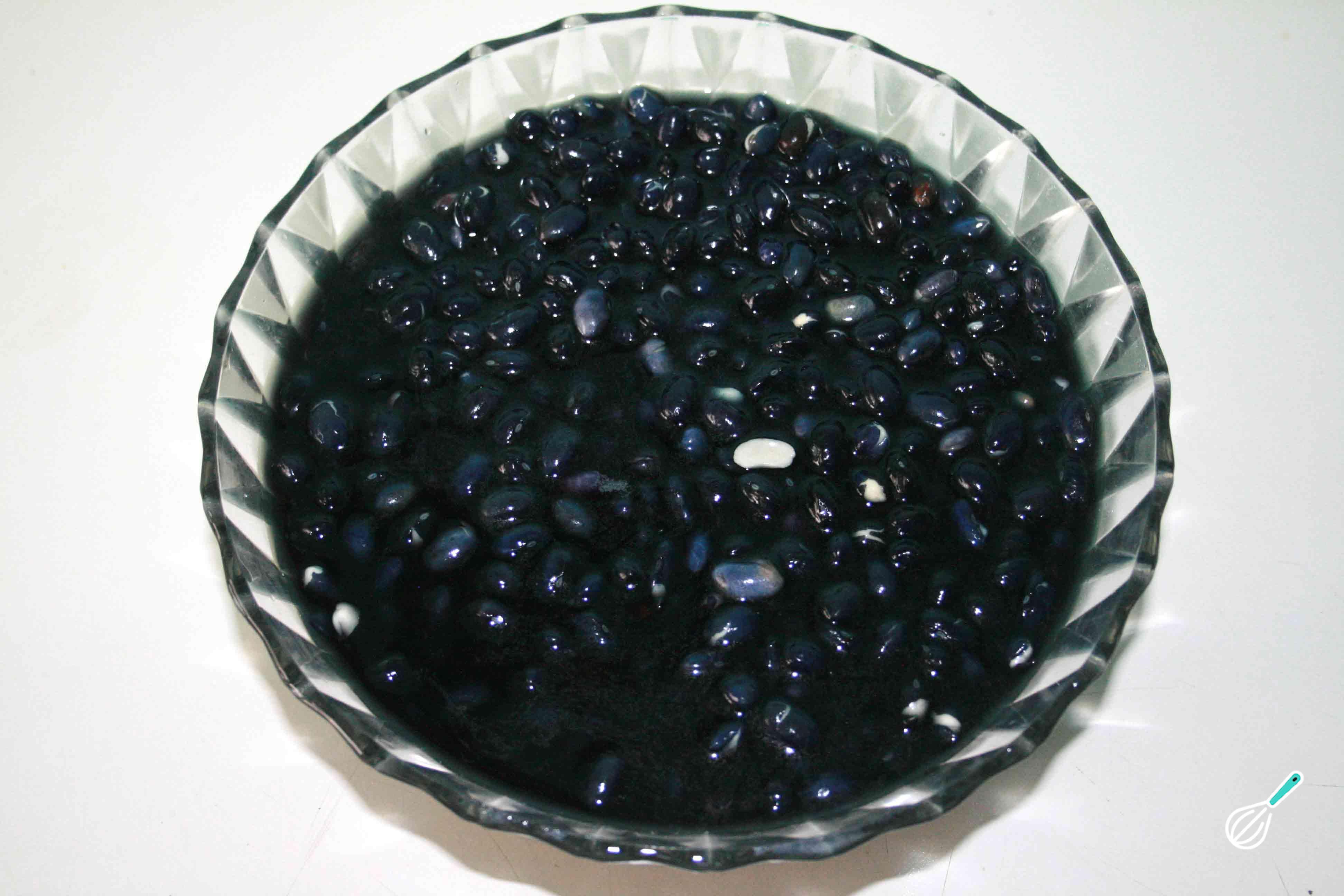 Coloque o feijão preto e o bicarbonato de sódio em um recipiente e acrescente água até cobrir 2 dedos acima do feijão. Cubra o recipiente e deixe o feijão hidratando por 24 horas.