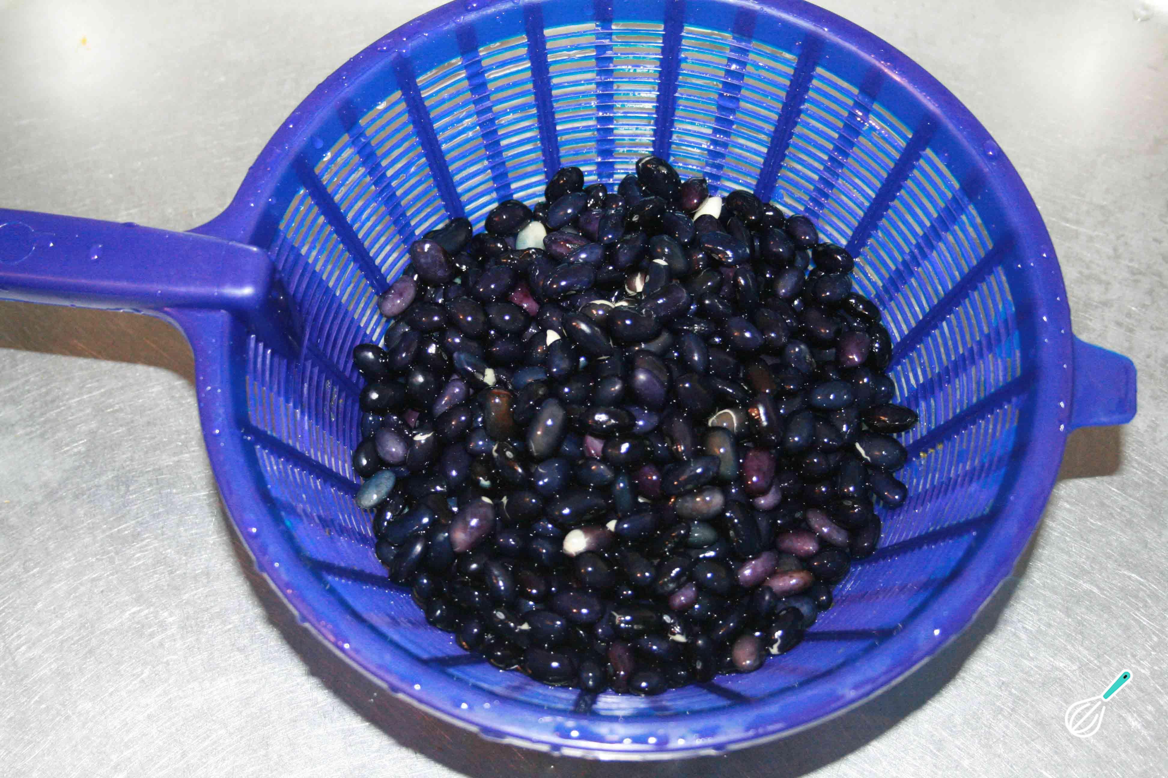 No dia seguinte comece preparando esta receita de feijão preto com legumes: escorra a água do feijão usando um coador e lave com água filtrada abundante.