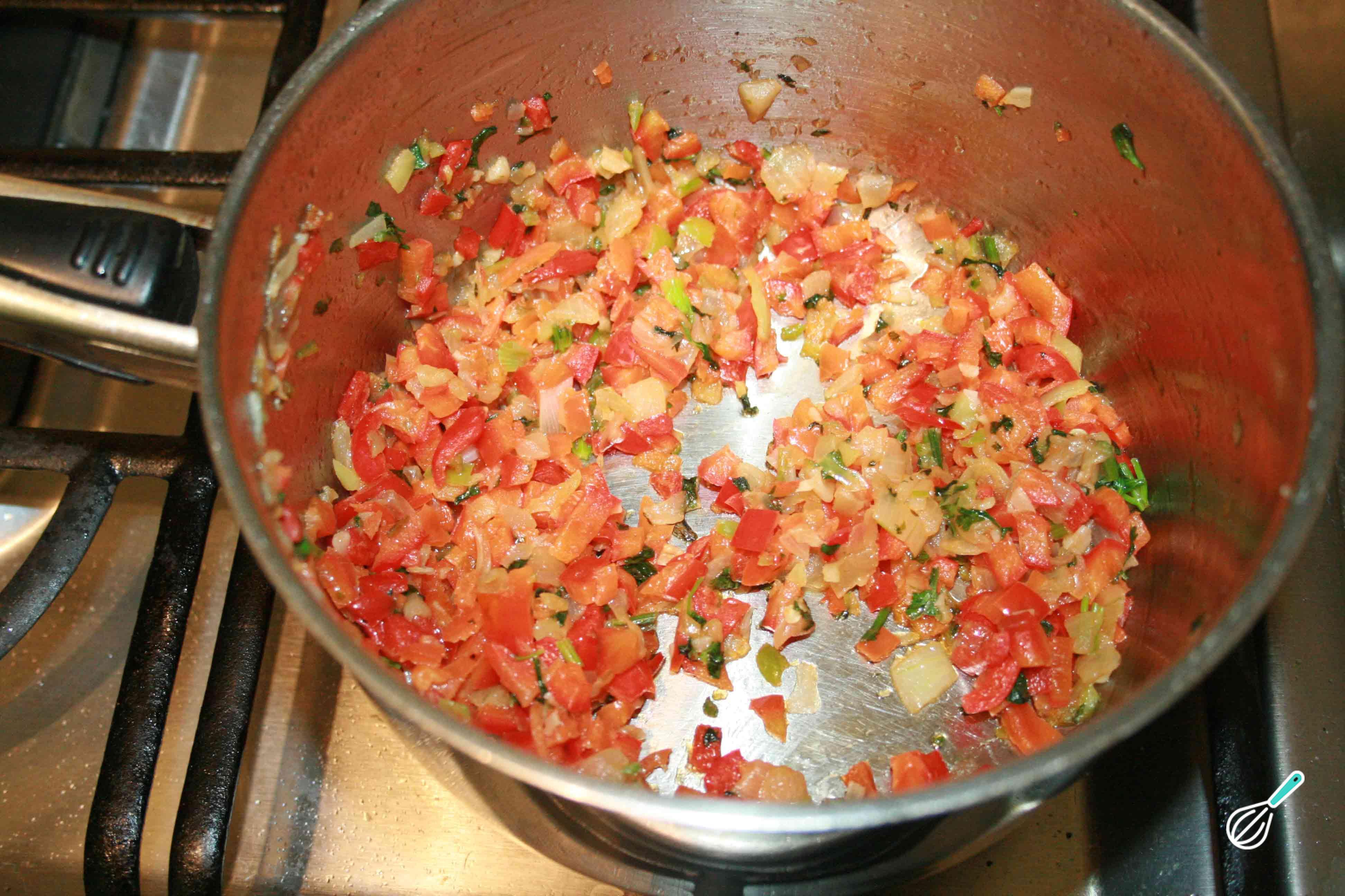 Numa panela à parte prepare o refogado com um pouco de óleo e os restantes legumes: primeiro doure a cebola, depois junte o alho, o pimentão e o coentro picado. Fique mexendo até os legumes amaciarem.