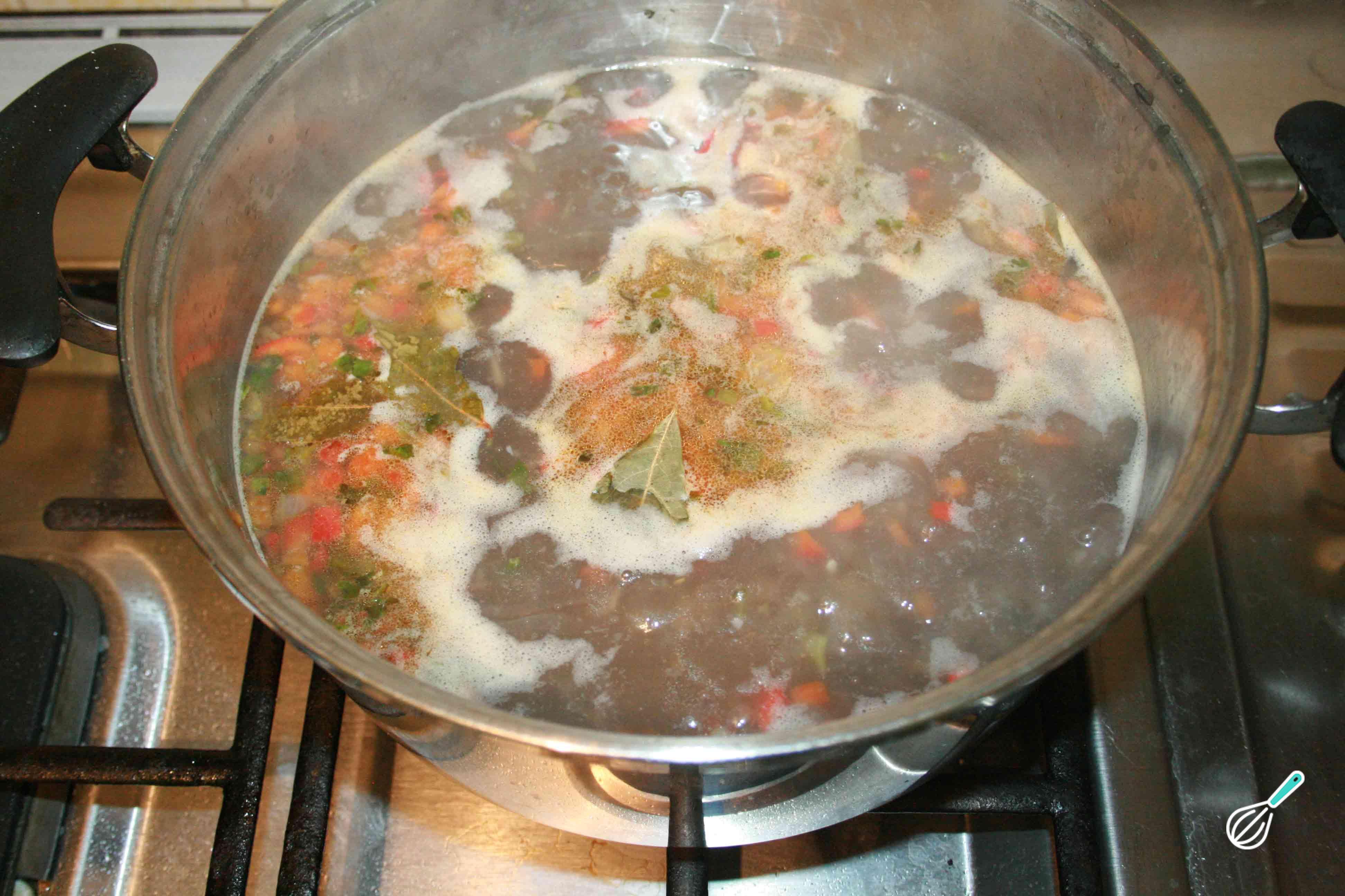Quando você observar que o feijão está começando a ficar macio, retire o pimentão, o coentro e a cebola e adicione o refogado do passo anterior junto com a folha de louro. Misture, tempere com cominhos e sal a gosto e deixe cozinhar até o feijão ficar ao seu gosto, com mais ou menos caldo.