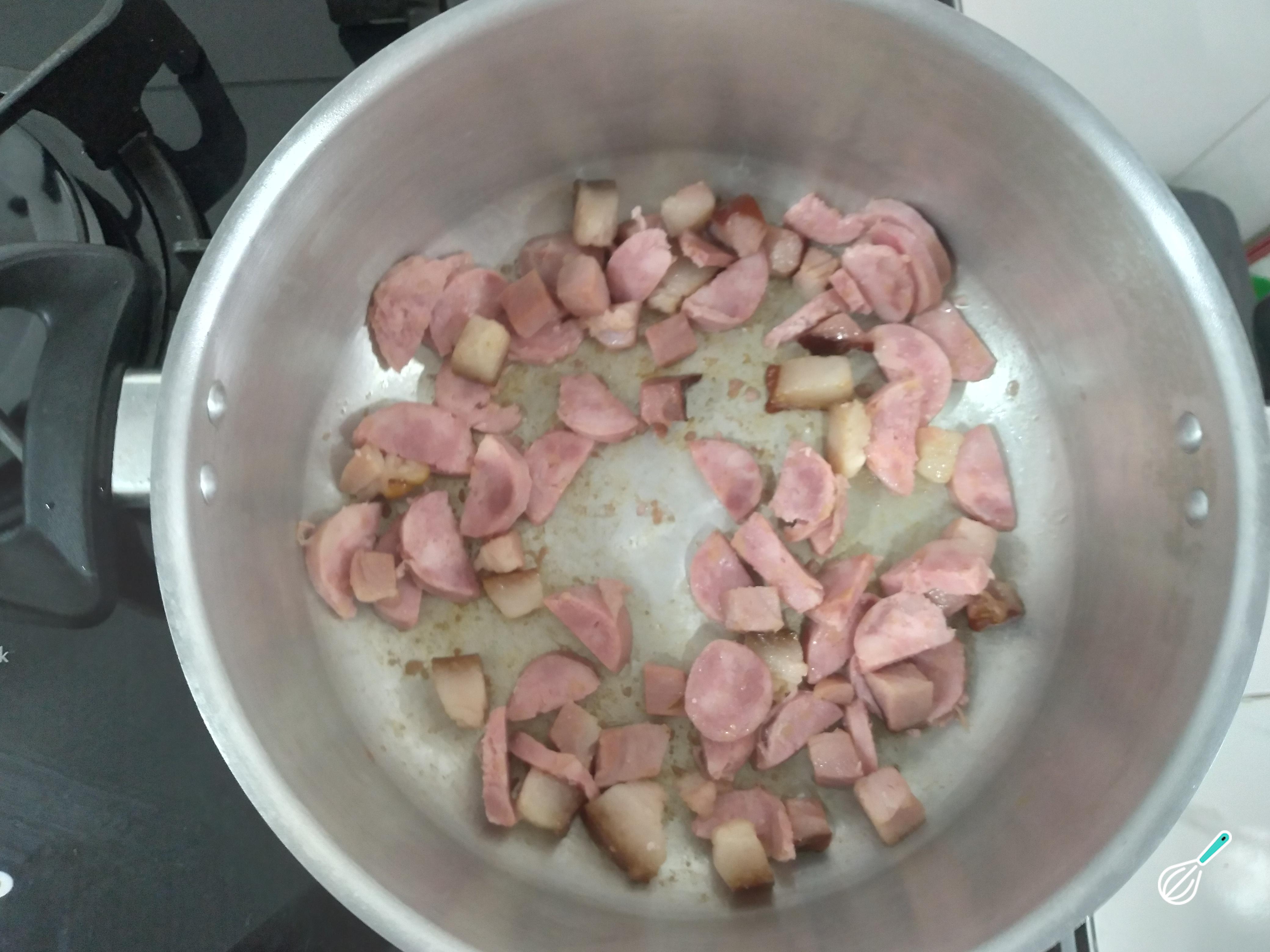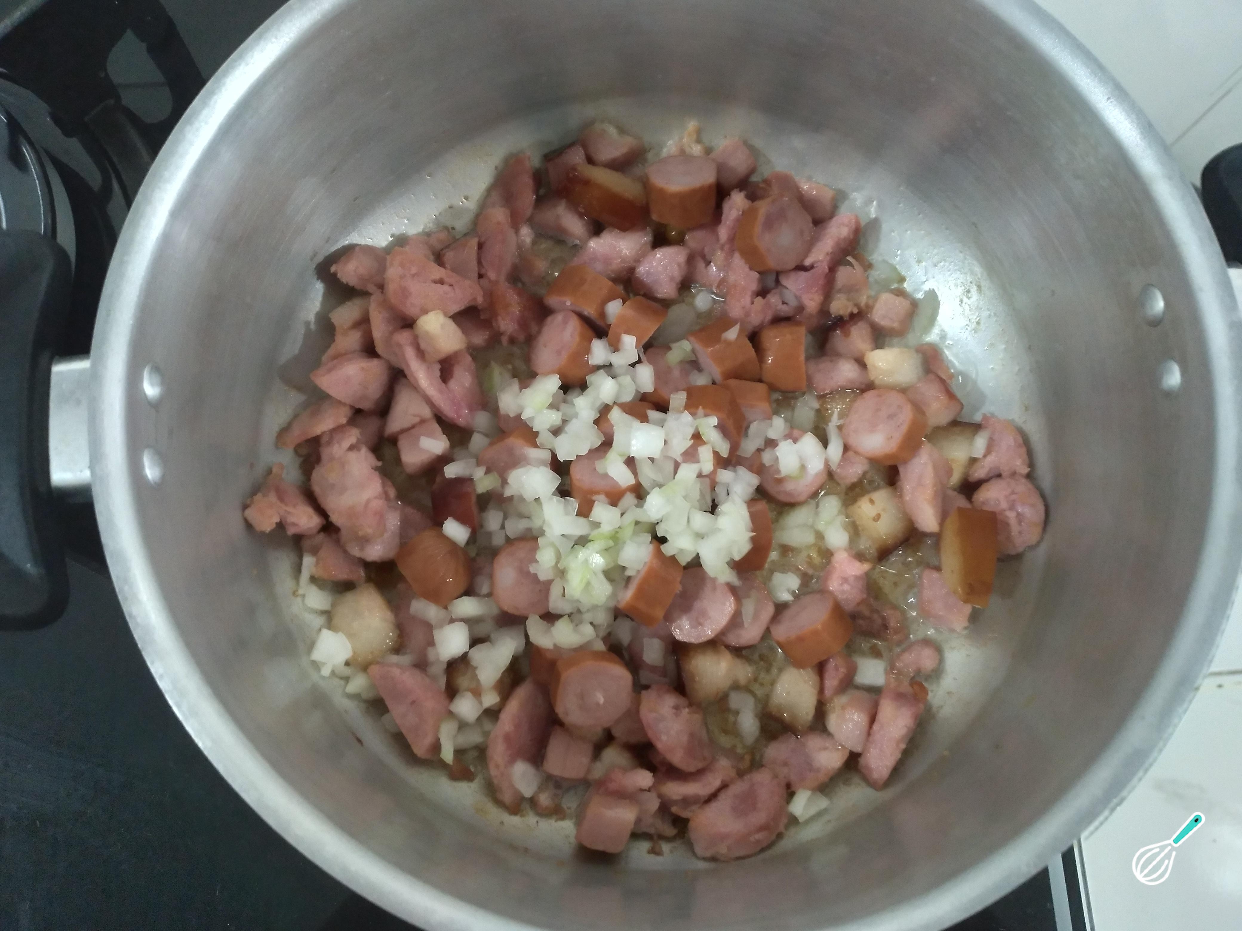 Em seguida, acrescente a linguiça mista e deixe fritar. Observe se precisa de mais óleo.
