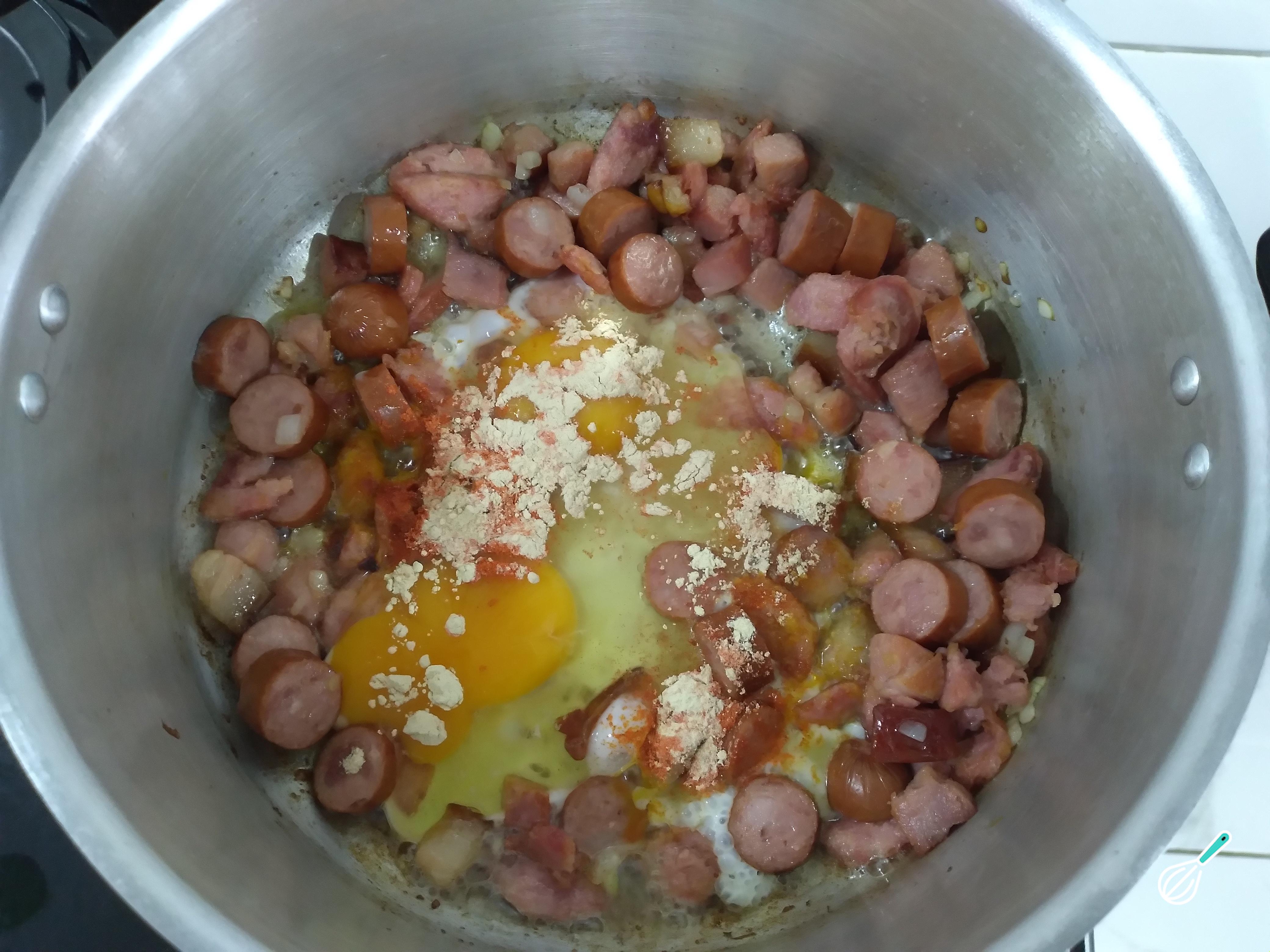 Acrescente os ovos e os temperos. Mexa pra fritar os ovos e pegar o sabor das carnes.