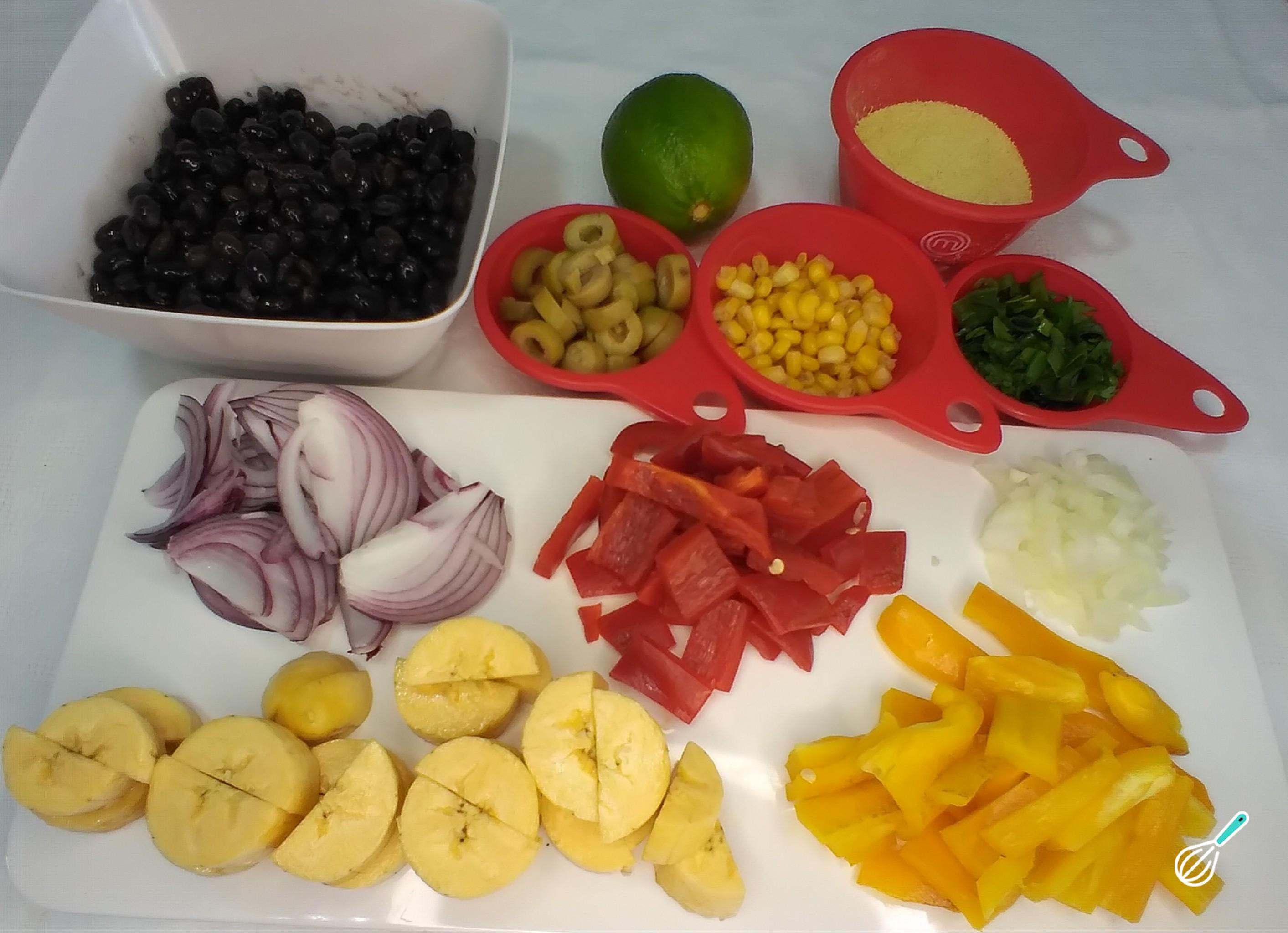 Feito isso, separe os ingredientes. Separe o feijão, meça a farinha de mandioca. Corte a cebola branca em quadradinhos e a cebola roxa em formato de lua. Assim ficarão mais bonitas no prato. Corte a banana da terra em pedaços de meia-lua. Os pimentões em tiras e depois em retângulos.